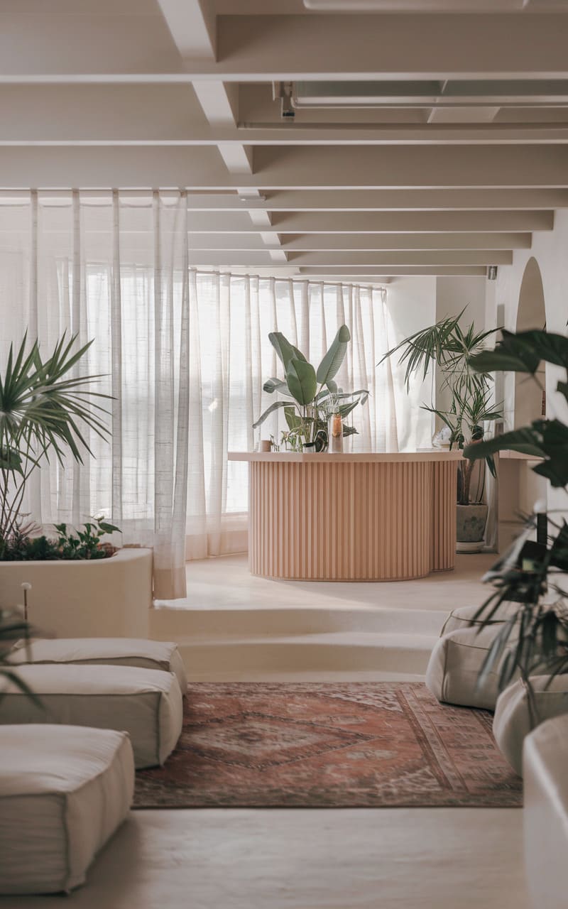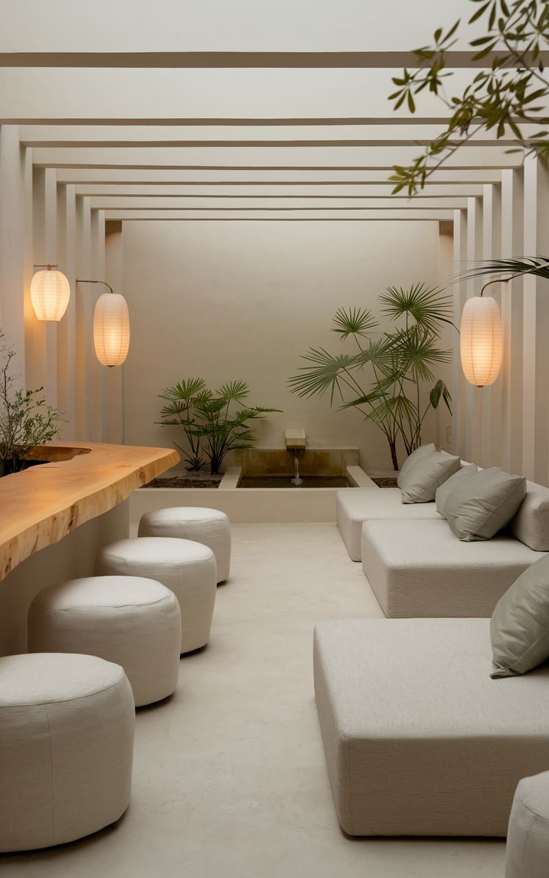 Imagine stumbling upon a serene sanctuary, cleverly disguised as a home speakeasy, where minimalist elegance meets tranquil sophistication. This isn’t your typical dimly lit hideaway; instead, it’s a bright, airy space defined by clean lines, neutral tones, and an almost Zen-like aesthetic. The focal point is a striking live-edge wooden bar, its natural beauty juxtaposed against the sleek, modern backdrop. Plush, rounded seating in a soft, creamy hue invites relaxation, while strategically placed greenery echoes the organic feel of the bar top, creating a harmonious balance. Lantern-like lighting casts a warm glow, highlighting the textured walls and contributing to the intimate, yet open atmosphere. A glimpse of a serene courtyard through the far window hints at an outdoor oasis, further blurring the lines between inside and out, making this speakeasy a unique haven of calm and understated luxury.