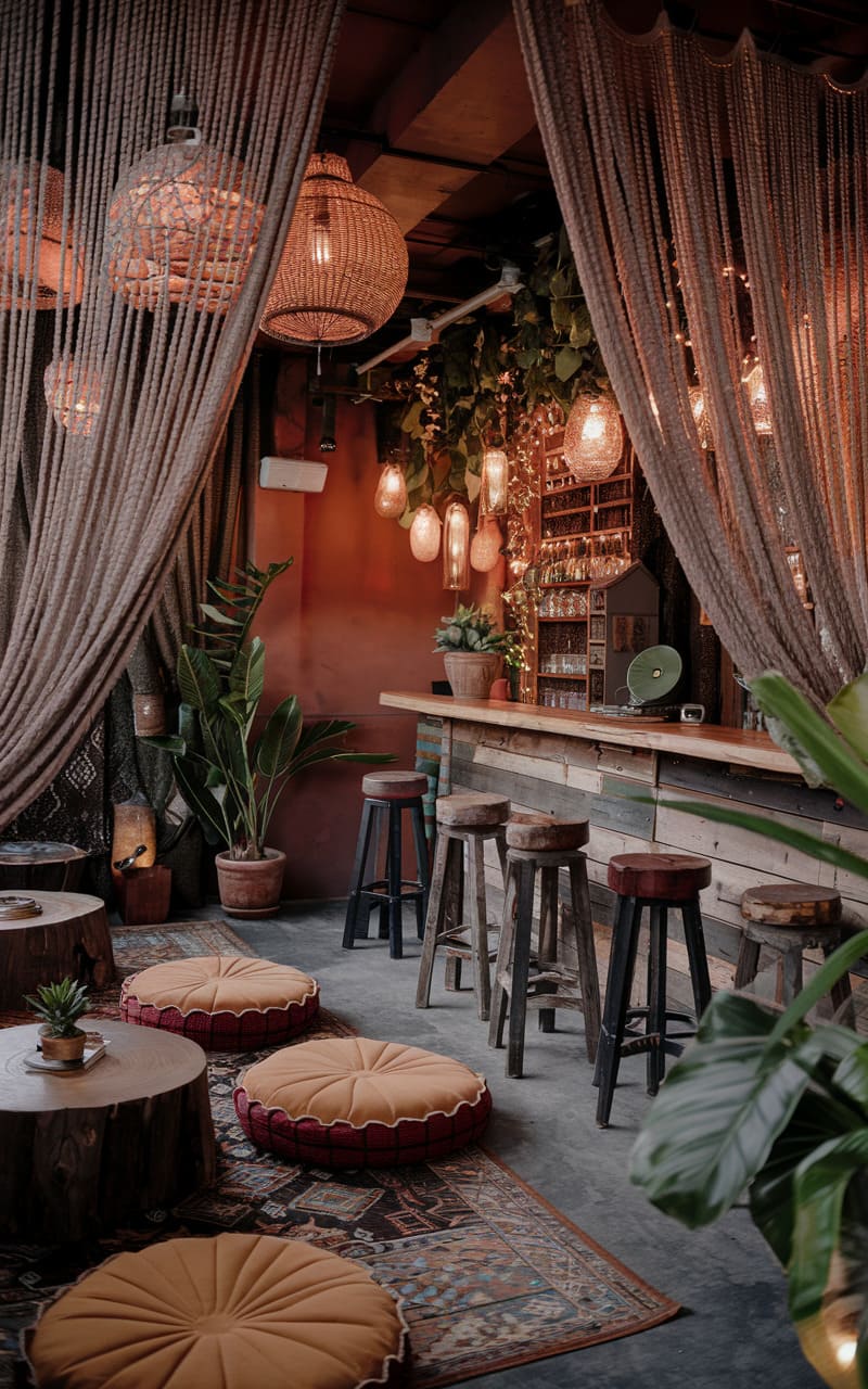 Stepping into this clandestine abode, one is enveloped by a rich tapestry of textures and tones, where exposed brick meets plush velvet seating and the warm glow of Edison bulbs dances across an array of spirits. Macrame wall hangings evoke a bohemian flair, contrasting with the rustic charm of the wooden bar and stools, while verdant foliage cascades from above, softening the industrial edge of the space. A vibrant rug anchors the scene, its intricate patterns echoing the eclectic mix of cushions scattered across the floor, inviting patrons to sink into the cozy depths of this hidden gem. Candles flicker atop repurposed cable spools, casting a soft, intimate light that beckons guests to linger and savor the moment, as if time itself slows within these welcoming walls.