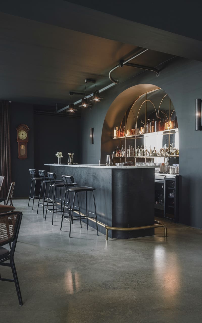 Nestled in the quietude of a private residence, this dapper speakeasy exudes a sophisticated charm with its moody grey hues and curated illumination. Smooth concrete walls provide an industrial backdrop, contrasting with the rich, dark countertop and sleek metal-framed seating. A mirrored niche showcases an array of spirits, while the soft glow of spherical lamps casts a warm ambiance over the intimate space. Modern yet timeless, this clandestine bar offers a refined retreat, complete with a plush bench and a low table set for indulgent relaxation.