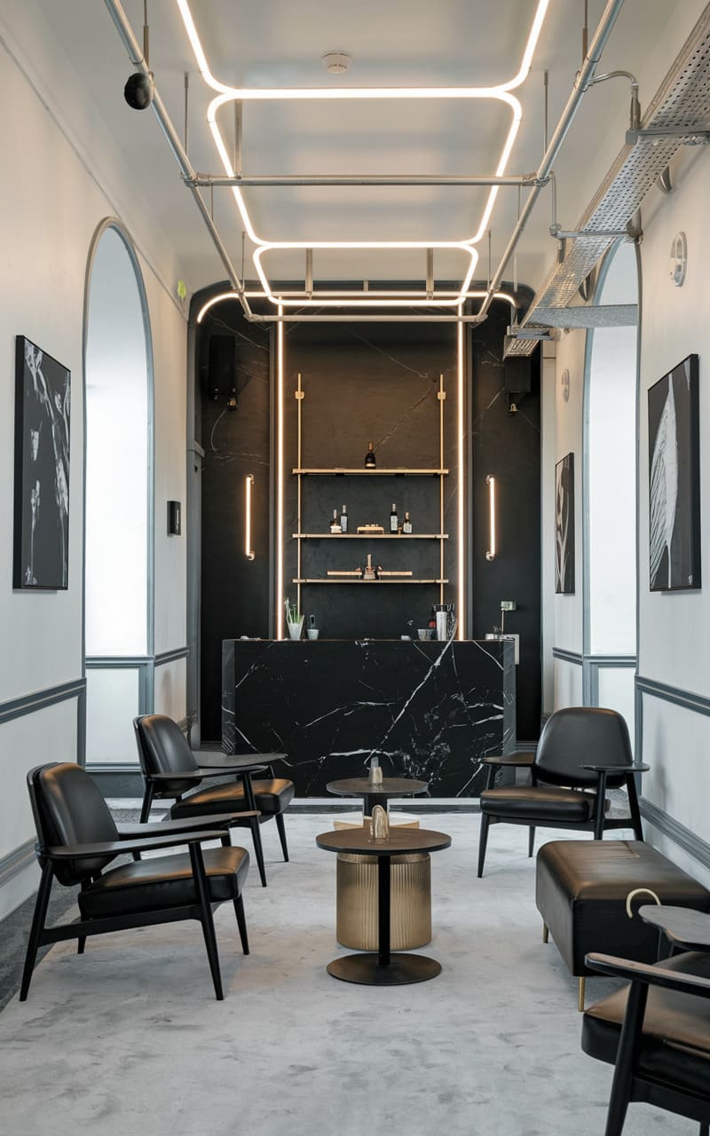 Bathed in the cool glow of a minimalist, almost clinical light, this contemporary speakeasy reimagines clandestine gatherings with a sleek, modern edge. A striking black marble bar, punctuated with slender brass shelving and neatly arranged bottles, anchors the space, its polished surface reflecting the neon accents of a geometric ceiling fixture. Plush leather seating, arranged in a semi-circle around a low, cylindrical table, offers a sophisticated perch for hushed conversations, while the monochromatic palette and clean lines create an atmosphere of understated elegance, a departure from the typically warmer, more cluttered aesthetic of traditional speakeasies. Hints of industrial chic, like the exposed ductwork and visible speaker, add a subtle rawness to the otherwise refined space.