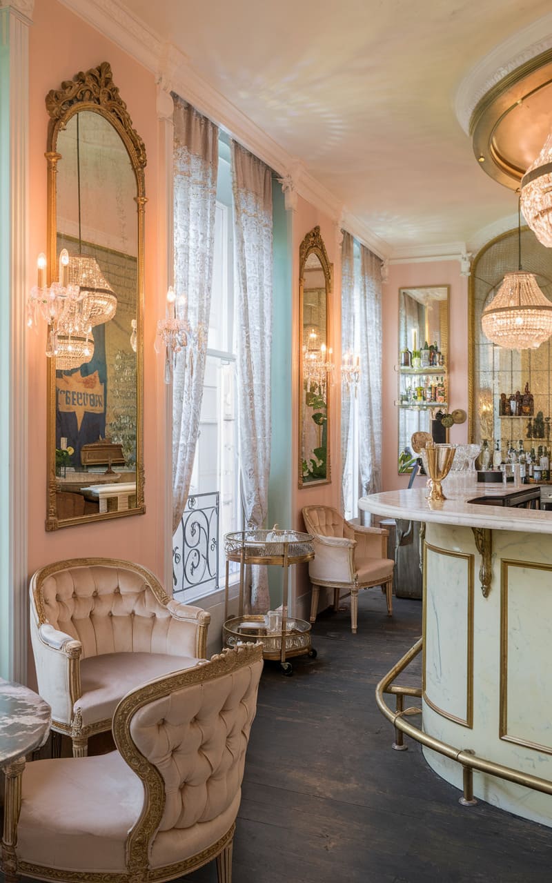 Bathed in a soft, rosy glow, this chic home speakeasy exudes an air of playful elegance. Plush velvet armchairs cluster around a low table, while the curvaceous lines of the ornate bar beckon with promises of crafted cocktails. Glimmering chandeliers cast a warm light, catching the sparkle of glassware and the subtle shimmer of mirrored panels that line the walls. Pale pink walls and delicate drapery enhance the feminine touch, creating a space that feels both intimate and inviting, a boudoir-inspired escape within the home. One can easily imagine laughter and hushed conversations filling this stylishly feminine retreat.