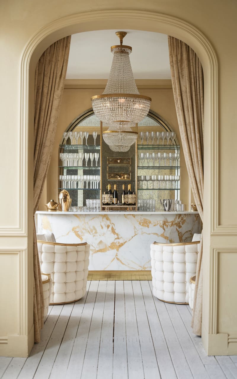 Framed by a graceful archway, this elegant home speakeasy whispers of bygone glamour and intimate gatherings. A dazzling crystal chandelier casts a warm glow upon the scene, highlighting the plush, tufted seating and the sleek, marbled bar stocked with gleaming glassware and spirits. The mirrored backdrop reflects light and creates an illusion of depth, while the soft textures of the drapes and upholstery invite guests to linger in this sophisticated space designed for relaxed indulgence and hushed conversations. Pale tones and clean lines lend a modern touch to the classic design, making it a haven of refined revelry.