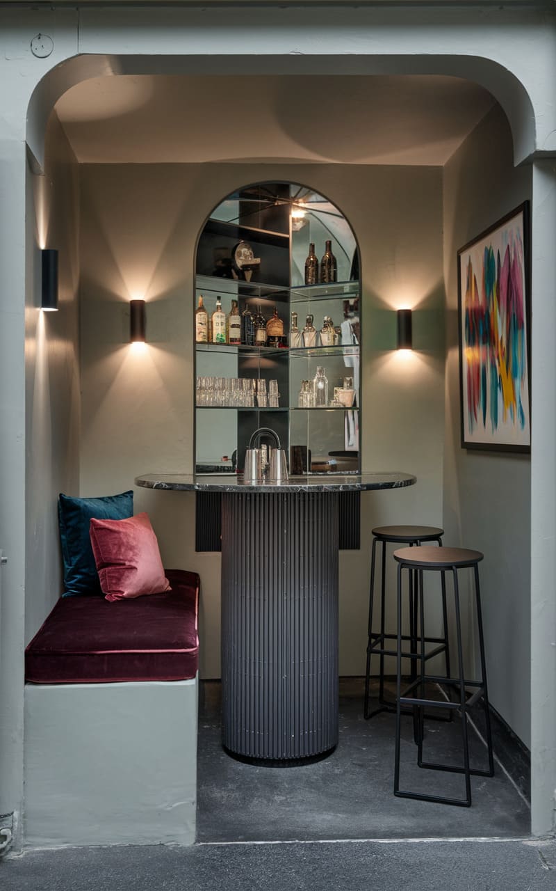 Nestled within a muted, arched alcove, this compact home speakeasy makes a bold statement with its sleek, contemporary design. A round, black marble table, paired with minimalist stools, centers the space, while a plush, plum-colored banquette tucked into the corner offers a cozy spot for intimate conversations. The back wall features a mirrored niche displaying a curated selection of spirits, illuminated by the warm glow of modern sconces, and a vibrant abstract painting adds a splash of color against the subdued palette, suggesting a sophisticated yet playful ambiance.