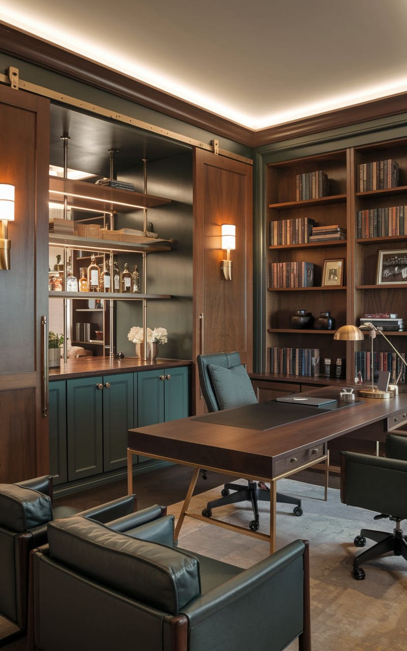Tucked behind unassuming wood paneling, this clandestine space exudes an air of refined revelry. A sliding door reveals a warmly lit, intimate setting, where deep green cabinetry contrasts with rich wood tones and the golden glow of overhead lighting. Plush leather seating beckons from around a sleek, modern desk, while a well-stocked bar tucked against the back wall promises expertly crafted cocktails. The room feels like a secret sanctuary, a place to unwind in sophisticated style, far from the clamor of the outside world.