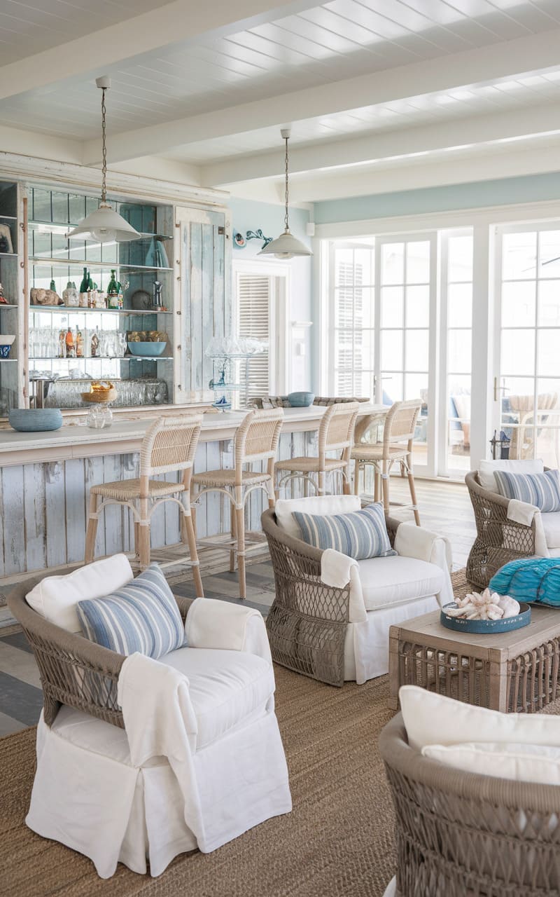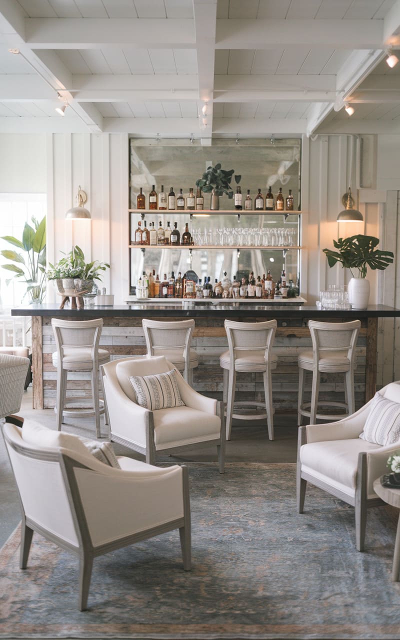 Sunlight streams into this airy, coastal-inspired home speakeasy, a departure from the dimly lit, shadowy spaces typically associated with clandestine drinking. Crisp white walls and a beamed ceiling create a bright, inviting ambiance, while natural wood accents on the bar and shelving add warmth and texture. Plush, off-white armchairs beckon patrons to relax and enjoy the serene surroundings, their neutral tones echoed in the striated rug beneath. A mirrored backsplash reflects the neatly arranged bottles and glassware, enhancing the sense of light and space in this sophisticated sanctuary, where secrets are shared in hushed tones amidst a serene, beach-house vibe.
