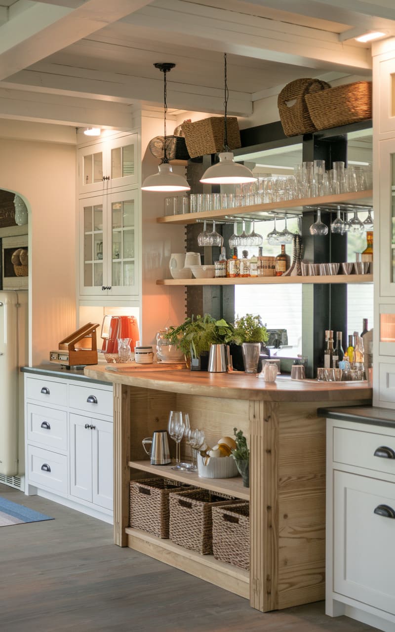 Sunlight streams into this unexpectedly bright speakeasy, illuminating a clean, contemporary space with a decidedly unstuffy vibe. Crisp white cabinetry and shiplap paneling provide a fresh backdrop for the natural wood bar, where an array of glassware hangs ready for service. Woven baskets offer practical storage and a touch of texture, while a smattering of greenery adds a breath of life to the organized scene. The juxtaposition of classic elements, like the glass shelving, with the more casual, almost farmhouse feel, creates an inviting atmosphere that feels more like a chic pantry than a shadowy hideaway.