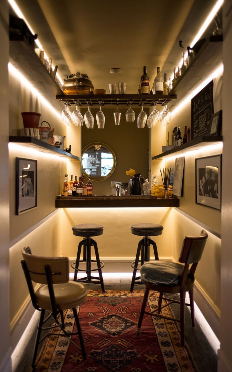 Nestled in a warm, alcove-like space, this petite home bar exudes an intimate and inviting ambiance. Soft, diffused lighting highlights the carefully arranged bottles and glassware on the floating shelves, while the mirrored backdrop adds depth and a touch of glamour. Two sleek bar stools invite patrons to linger over their drinks, and the rich texture of the patterned rug anchors the space, grounding the composition. Every element, from the neatly hung glassware to the framed artwork, contributes to the cozy and sophisticated atmosphere of this tucked-away gem, promising a discreet and delightful experience.