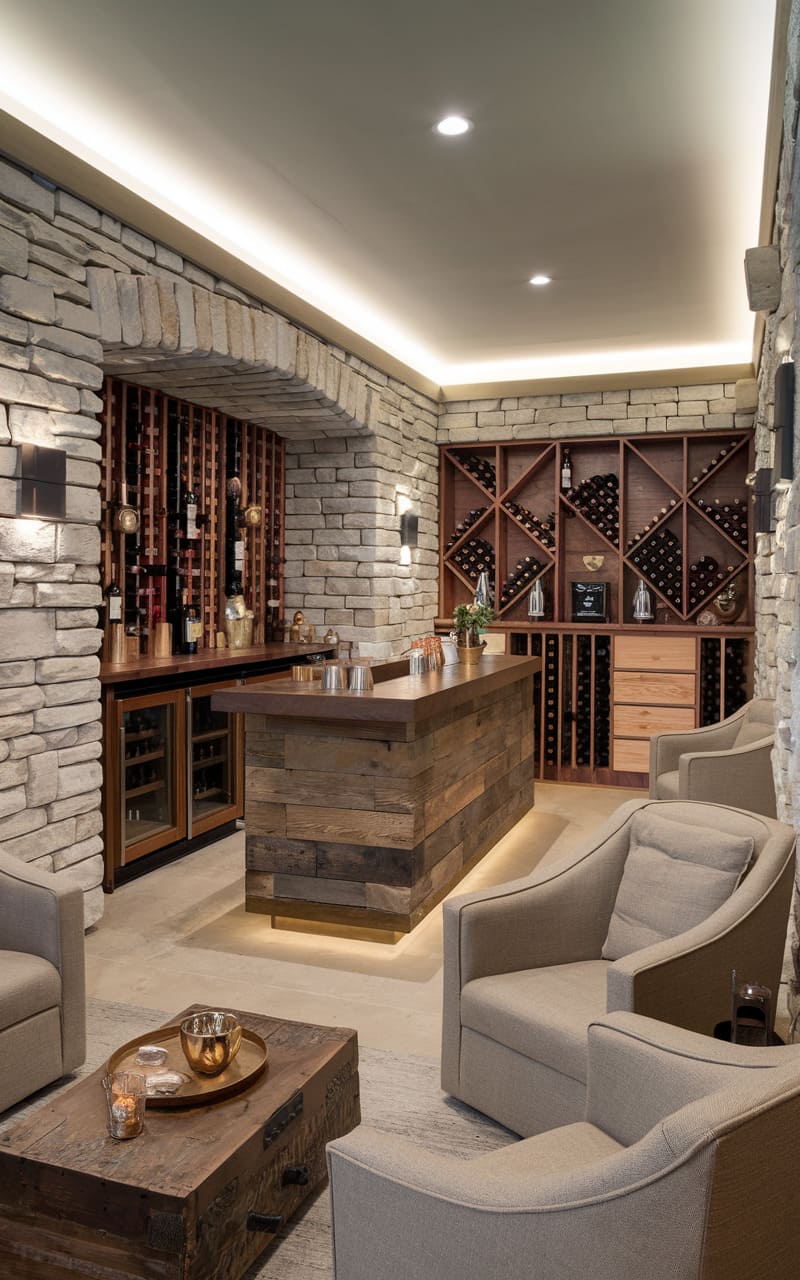 Evoking a rustic yet refined charm, this home speakeasy unfolds as a haven of warm tones and curated spirits. Exposed stone walls provide a textured backdrop, contrasting beautifully with the sleek, reclaimed wood of the central bar. Illuminated shelving showcases an impressive array of bottles, while comfortable armchairs beckon patrons to unwind in the soft glow of recessed lighting. Every element, from the carefully chosen glassware to the earthy accents, contributes to an atmosphere that feels both intimate and effortlessly stylish, a perfect blend of rugged sophistication and modern comfort.
