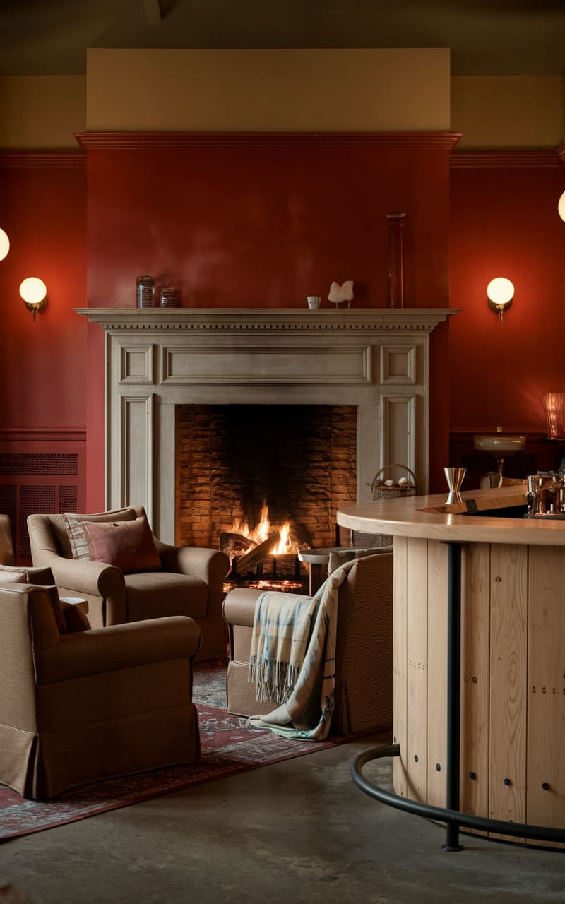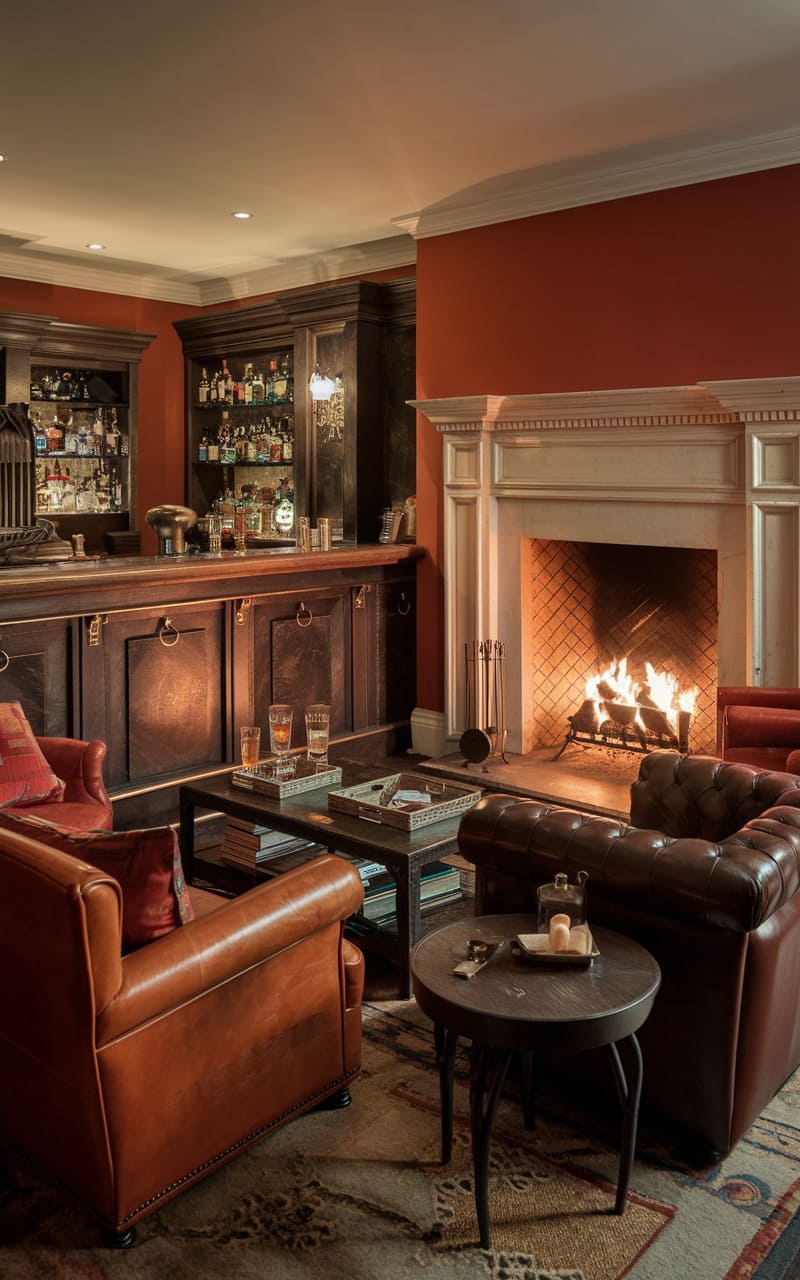 Envision a haven of warmth and camaraderie, where a home speakeasy unfolds in a rich tapestry of autumnal hues and inviting textures. The focal point is a classic fireplace, its brick surround glowing with the flickering light of a cozy fire, flanked by supple leather armchairs that promise relaxation. A well-stocked bar stands ready to dispense cheer, its dark wood construction and gleaming glassware hinting at sophisticated libations. The warm, terracotta-toned walls provide a backdrop that’s both vibrant and comforting, while the patterned rug anchors the space with a touch of subtle elegance. Every element contributes to an atmosphere of intimate conviviality, a perfect setting for hushed conversations and shared laughter.