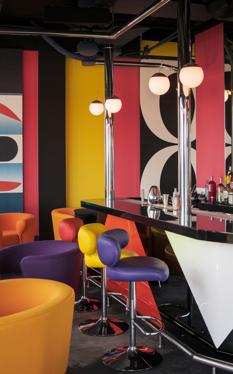 A vibrant burst of retro flair defines this unique home speakeasy, where bold primary colors and playful geometric patterns collide in a dazzling display of design. Chrome accents gleam under the soft glow of spherical pendant lights, highlighting the sleek bar counter and invitingly plush, color-blocked seating. The mirrored backdrop playfully amplifies the energetic atmosphere, hinting at a space designed for both lively gatherings and intimate conversations, all underscored by a distinctly whimsical, almost Wes Anderson-esque aesthetic.