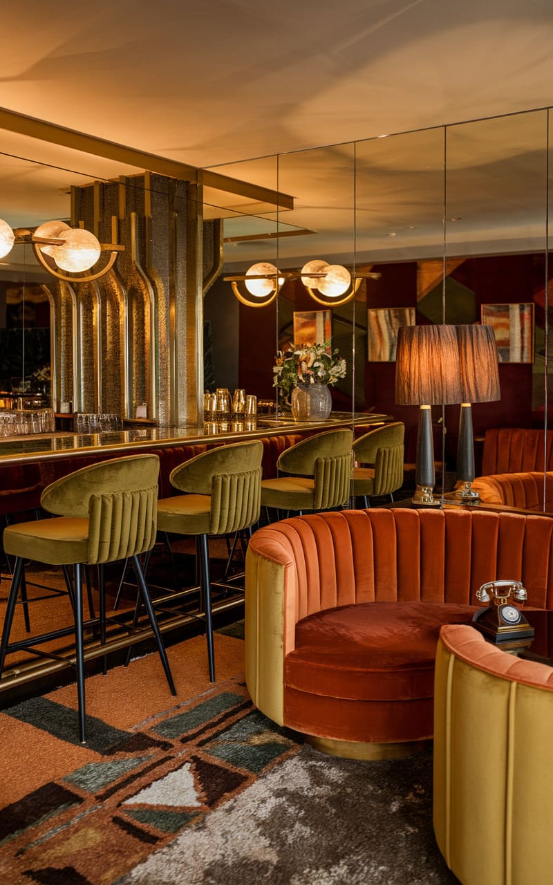 A symphony of textures and tones unfolds in this stylish home speakeasy, where retro flair meets modern sophistication. Plush velvet seating in mustard and burnt orange hues invites conversation, while the mirrored backdrop of the bar reflects the warm glow of pendant lights and the gleam of glassware. Geometric patterns dance across the rug, anchoring the space with a touch of vintage charm, and the textured walls add an intriguing tactile dimension. A vintage telephone hints at clandestine calls and hidden connections, completing the scene with a dash of playful intrigue and suggesting an atmosphere where secrets are shared and stories unfold.