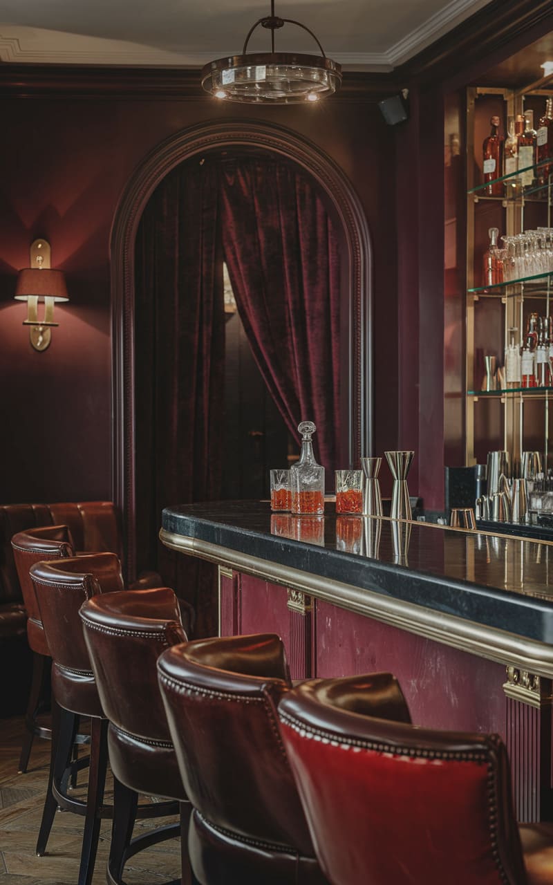 Enveloped in a rich, ruby glow, this home speakeasy exudes a seductive, vintage charm. Deep burgundy walls provide a dramatic backdrop to the polished black bar, its gleaming surface reflecting the warm light of a unique, ring-shaped pendant lamp. Plush leather barstools line the counter, inviting guests to partake in the artistry of mixology, while the arched doorway draped in matching velvet curtains hints at a secluded, equally sumptuous space beyond. A well-stocked, glass-shelved bar displays an array of bottles and gleaming glassware, promising expertly crafted cocktails, as the ornate detailing along the bar’s edge adds a touch of old-world elegance to the intimate setting.