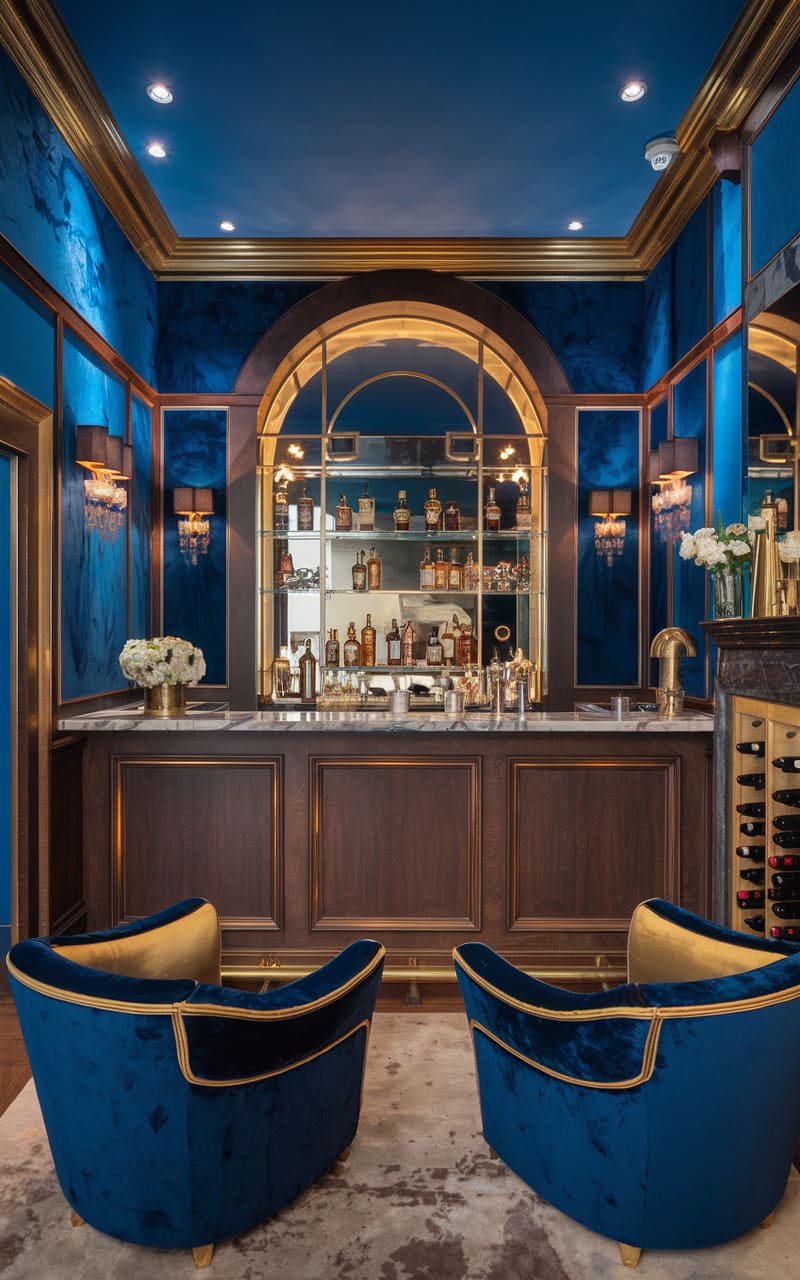Bathed in a mesmerizing blue, this home speakeasy radiates a sophisticated allure, a sanctuary of style and curated spirits. The deep sapphire walls, accented with gold trim and mirrored panels, create an opulent backdrop for the sleek bar and its array of gleaming bottles. Plush velvet seating in a coordinating blue invites intimate conversations, while the marble countertop and artfully arranged glassware speak to a refined taste. The arched display niche echoes the curves of the chairs, adding a touch of architectural interest to the intimate space. One can almost taste the expertly mixed cocktails and feel the velvety embrace of the surroundings in this haven of hushed elegance.
