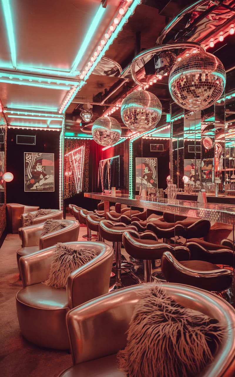 41. Retro 70s Speakeasy with Disco Ball and Velvet Upholstery