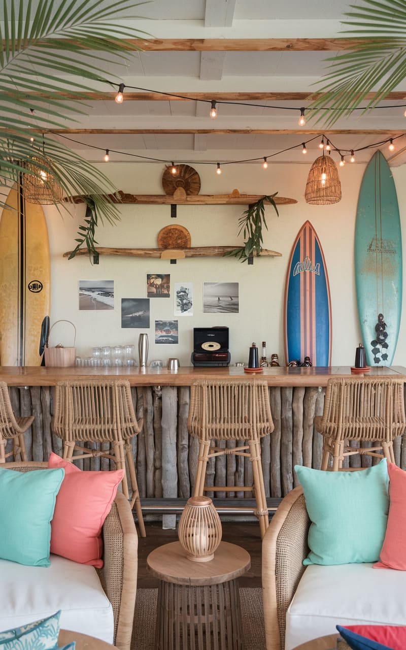 Sunlight spills into this breezy, bohemian hideaway, illuminating a collection of surfboards casually propped against a whitewashed wall, instantly setting a laid-back, beachy tone. Rattan bar stools line the driftwood-inspired counter, suggesting a spot for casual conversation and refreshing drinks, while string lights crisscross overhead, promising magical evenings in this tucked-away retreat. Touches of greenery and carefully curated travel photos add a personal touch, hinting at adventures and faraway shores, all contributing to the relaxed, carefree vibe of this unique home bar, where the spirit of the ocean meets the conviviality of a speakeasy.