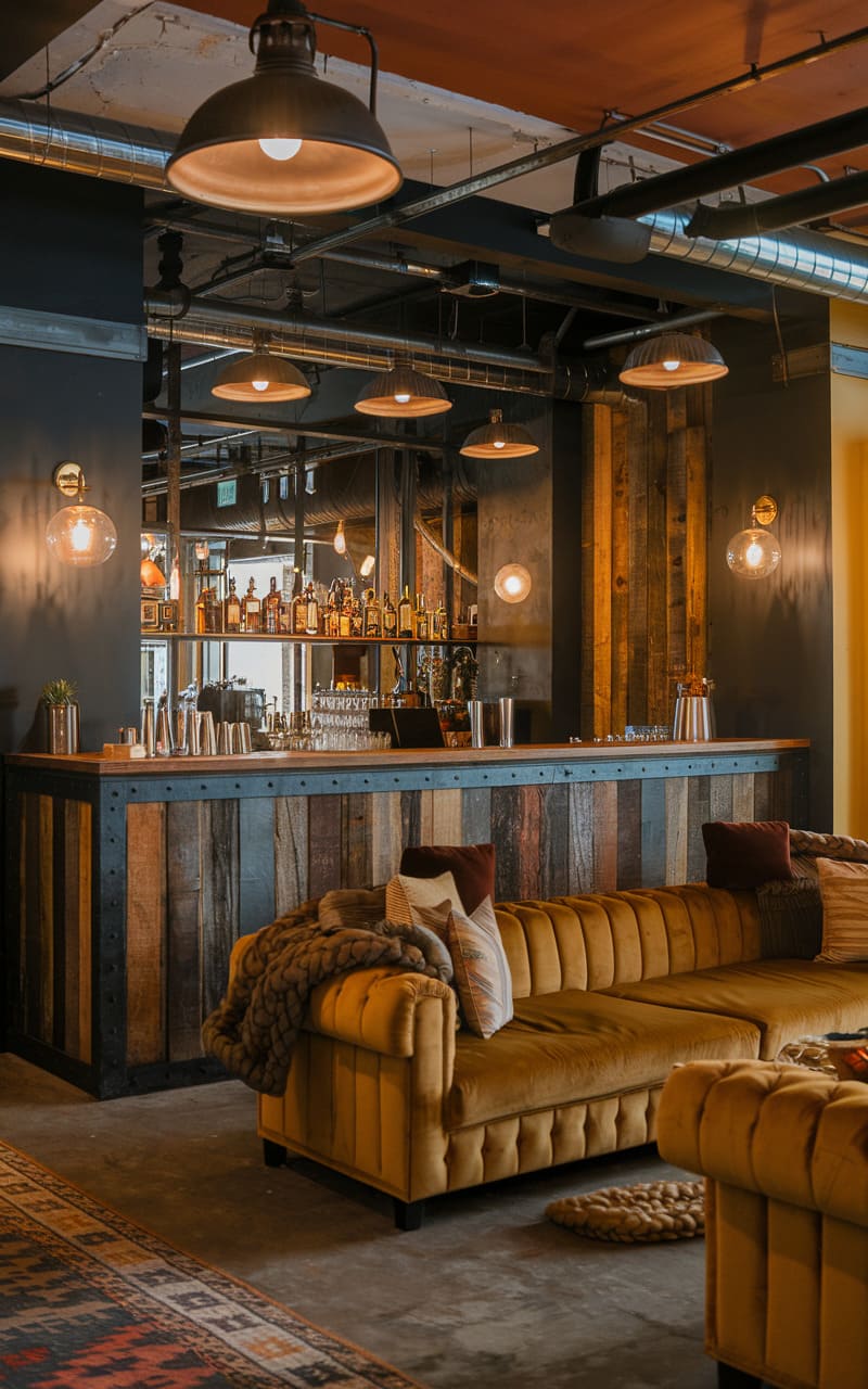 Evoking a raw yet refined aesthetic, this industrial-style speakeasy blends the charm of reclaimed materials with a distinctly modern edge. A plush, mustard-colored velvet sofa anchors the space, juxtaposed against the rough-hewn wooden planks and exposed pipes of the bar front. Warm, Edison-style bulbs cast a soft glow on the mirrored backsplash, illuminating the neatly arranged bottles and glassware. The polished concrete floor and visible ductwork further enhance the industrial vibe, while the thoughtful placement of vintage-inspired seating and a richly patterned rug adds a layer of comfortable sophistication. This isn’t simply a recreation of the past, but a bold reinterpretation, where disparate elements harmoniously converge to create a unique and inviting space for clandestine gatherings.