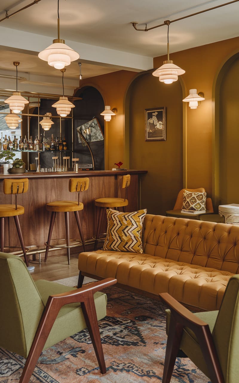 Bathed in a warm, mustard yellow hue, this retro-inspired speakeasy exudes a distinctly laid-back yet sophisticated vibe. Plush velvet seating in coordinating shades beckons patrons to unwind, while the vintage-inspired bar, complete with gleaming glassware and a mirrored backdrop, hints at expertly crafted cocktails. Globe pendant lights cast a soft glow across the scene, highlighting the rich textures and eclectic mix of patterns in the rugs and throw pillows. Arched doorways add architectural interest, framing vignettes of intimate conversation spaces within this cozy, nostalgic retreat, suggesting a space where time slows down and the focus is on good company and carefully curated drinks.