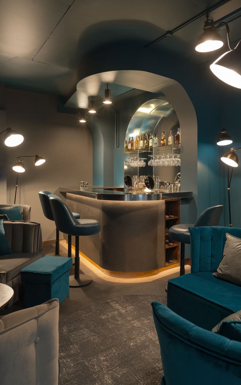 A retro vibe permeates this stylishly assembled home speakeasy, where a harmonious blend of teal, wood, and chrome creates a swanky, mid-century modern feel. The eye is immediately drawn to the curvaceous, wood-paneled bar, accented with sleek metal trim and stocked with a colorful array of bottles, promising a delightful selection of libations. A plush teal sofa echoes the bold color scheme, while the geometric rug adds a playful touch against the warm wood paneling of the walls. Overhead, stainless steel piping and minimalist lighting fixtures contribute to the clean lines and uncluttered aesthetic of the space, suggesting a sophisticated yet comfortable setting for intimate gatherings and spirited conversations.