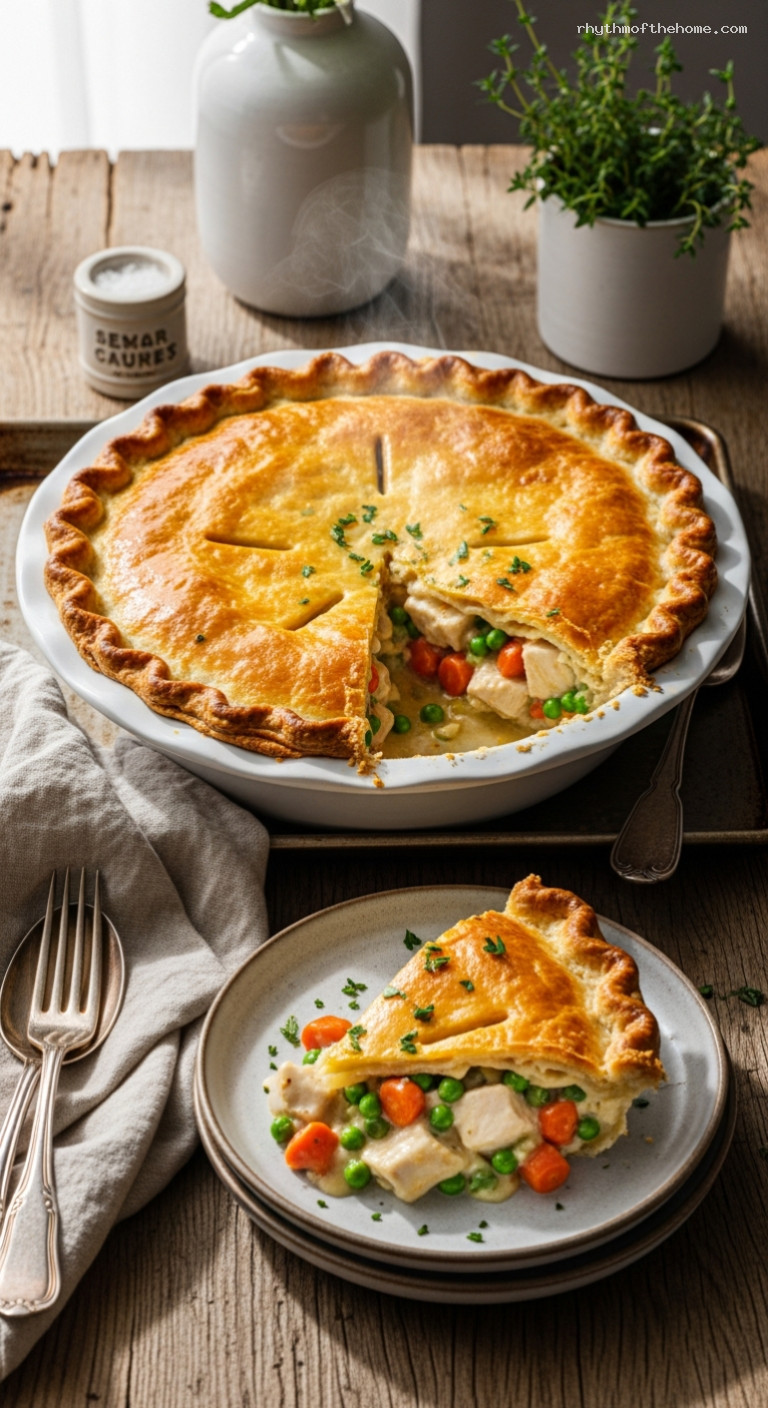 - Puff Pastry Top: Swap the pie crust for a well-chilled puff pastry sheet. Trim to fit, score a crosshatch pattern, vent, egg wash, and bake 25–30 minutes at 425°F.