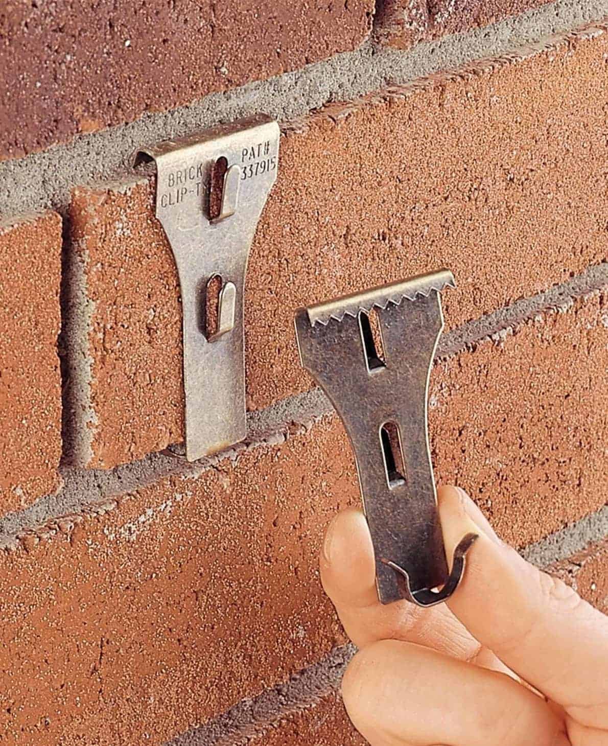 With the help of specialized clips that grip the brick, you can hang things without worries of them falling out. This is another practical method that doesn’t require drilling. Keep in mind that you should measure your bricks to purchase matching clips. Most models on the market are designed for average-sized bricks. Here’s a great set of brick clips from Amazon.