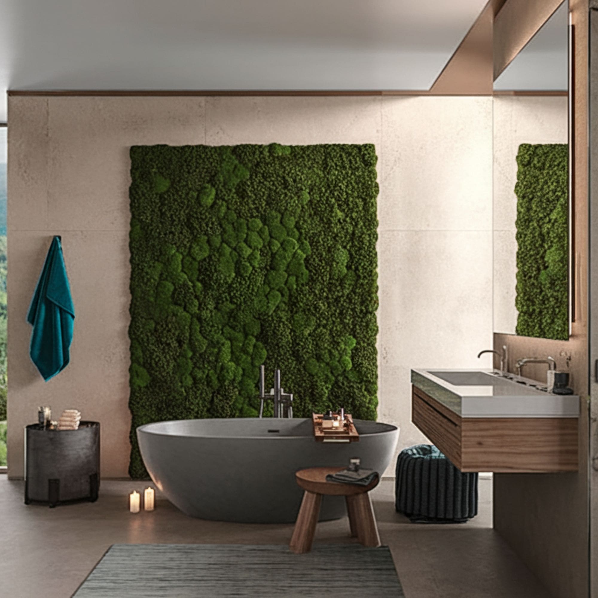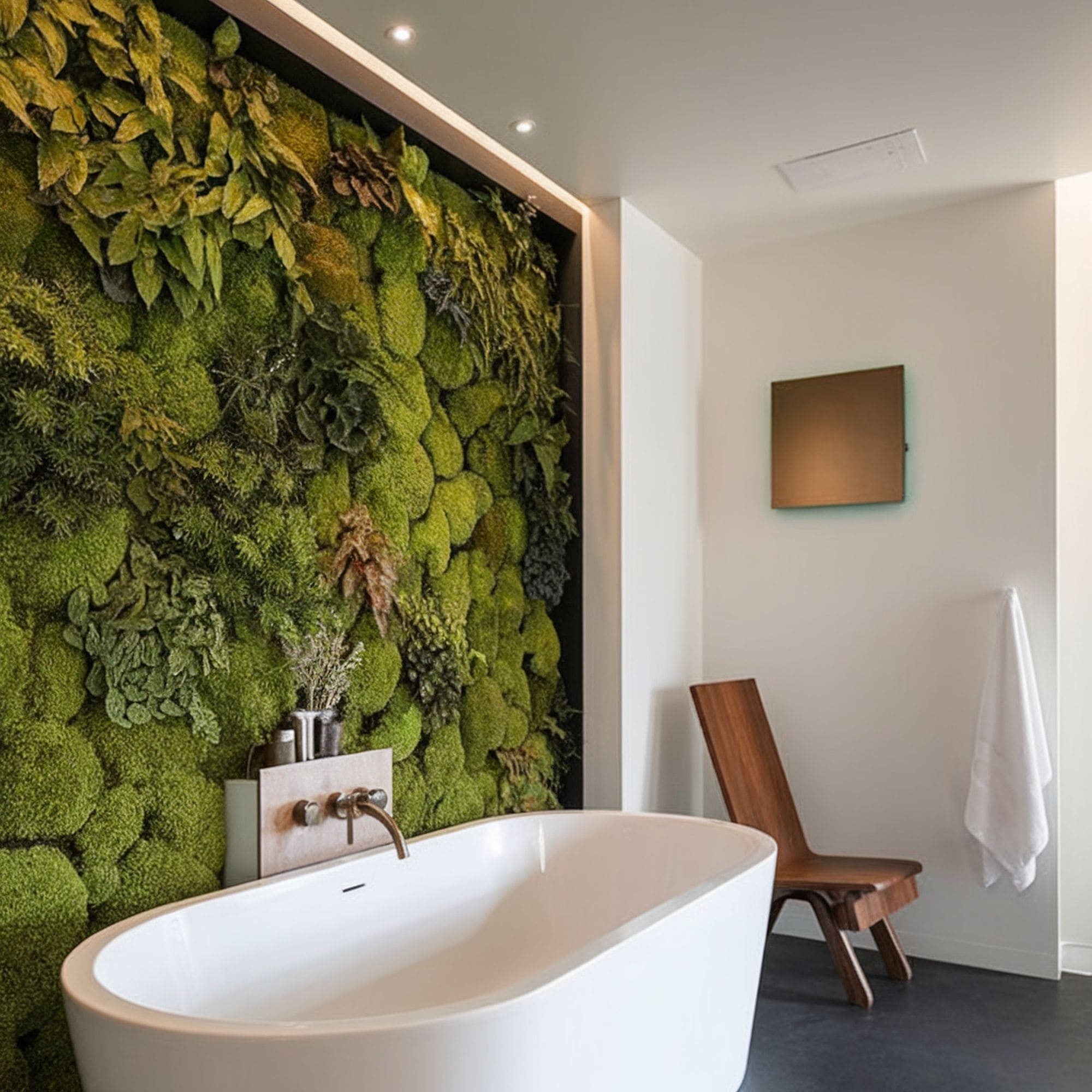 Resembling a tapestry, this living wall is also placed behind the bathtub. Apart from its beauty, you will also enjoy fresh air, a relaxing atmosphere, and an unmistakable fragrance. As we’ve already seen, living walls are suitable for all bathrooms because they soak up the humidity.