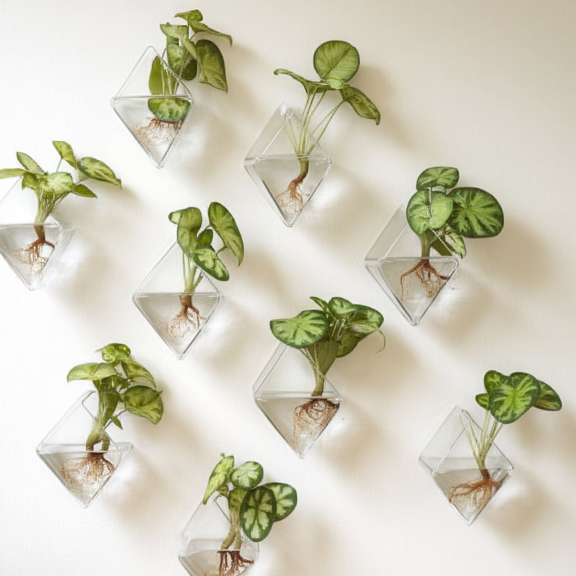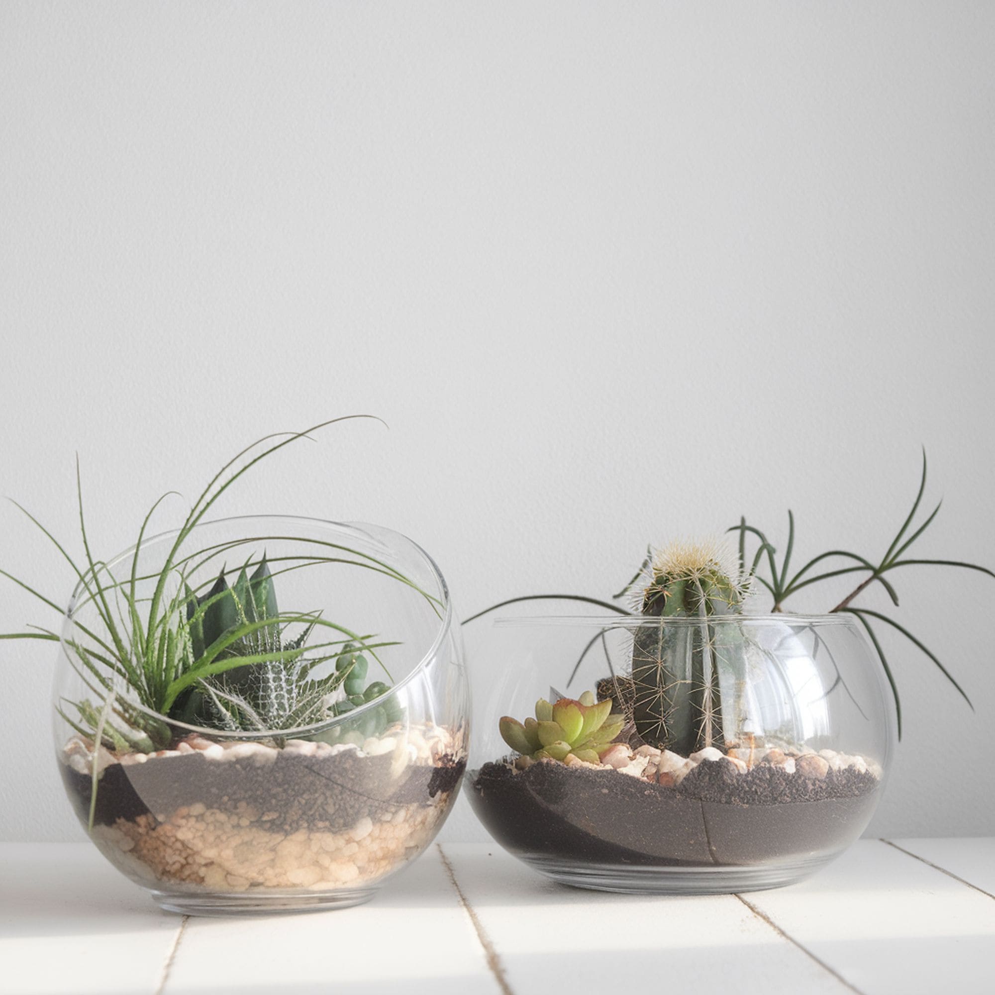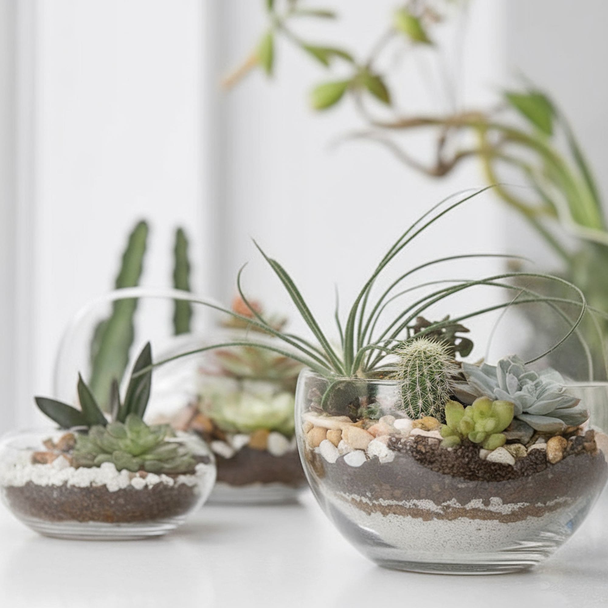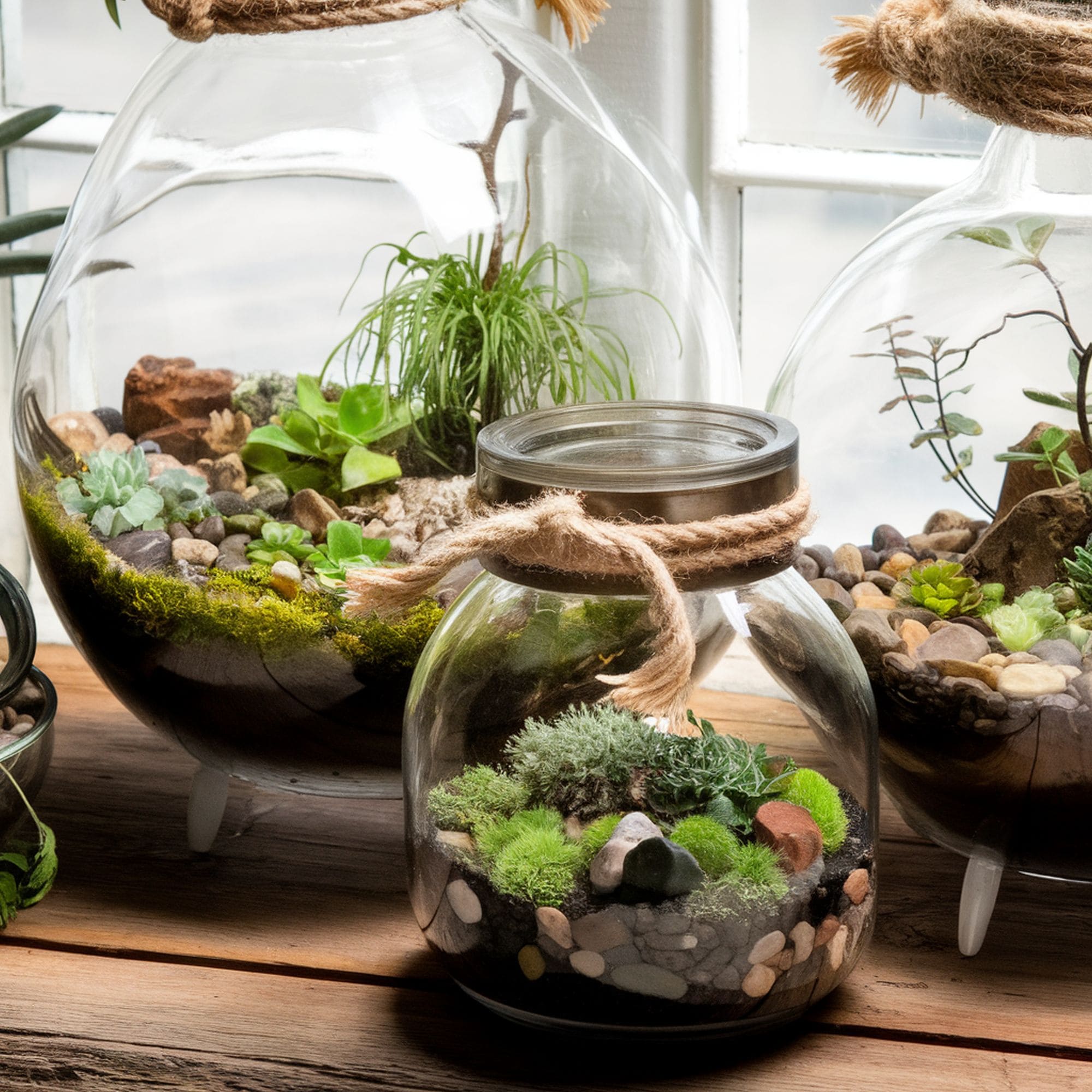 Glass terrariums consist of glass containers filled with mesmerizing plants, stones, and other decorative items. It’s best to add plants that thrive in wet, moist soils because the glass containers lack drainage holes. However, you can still add other varieties as long as you follow a precise watering schedule.