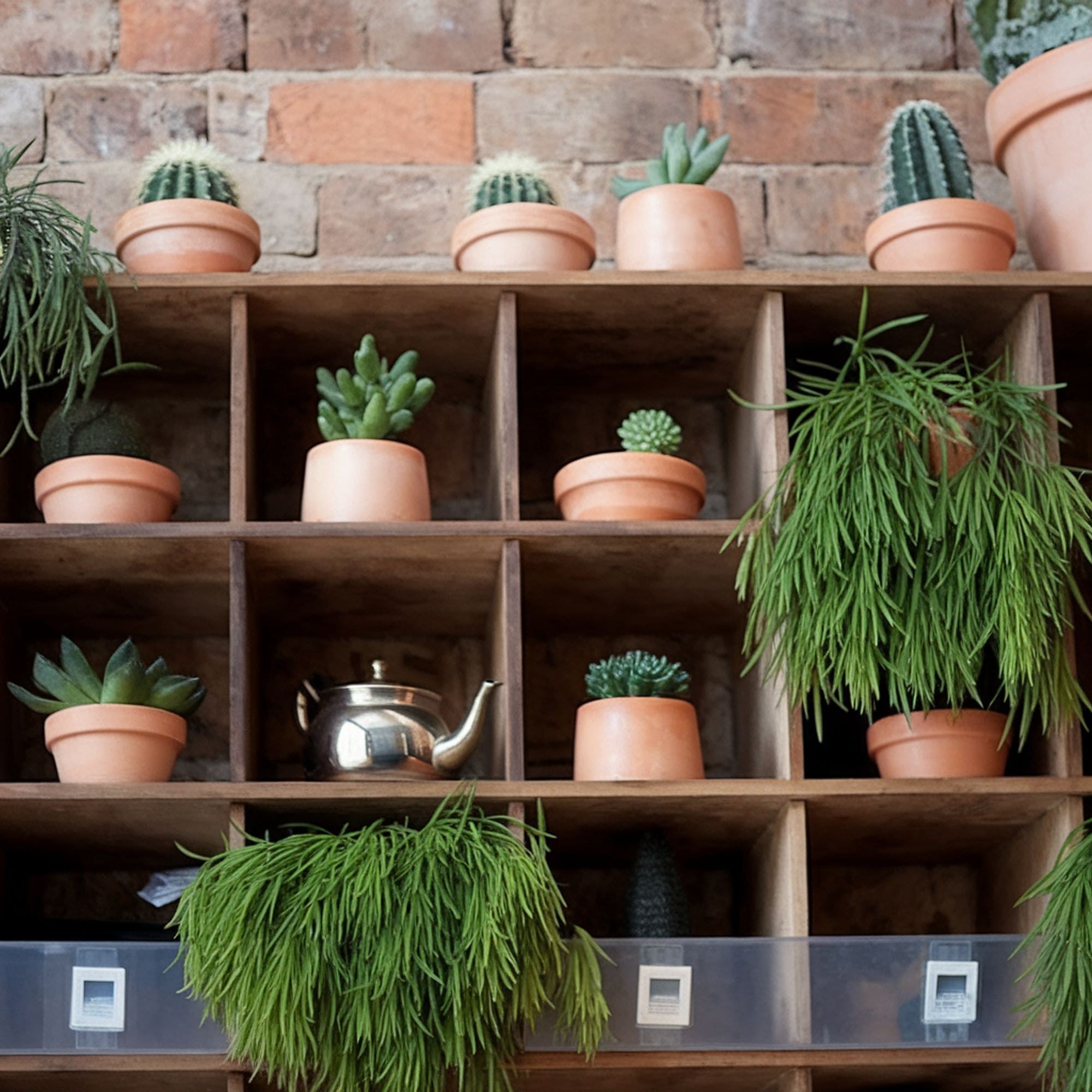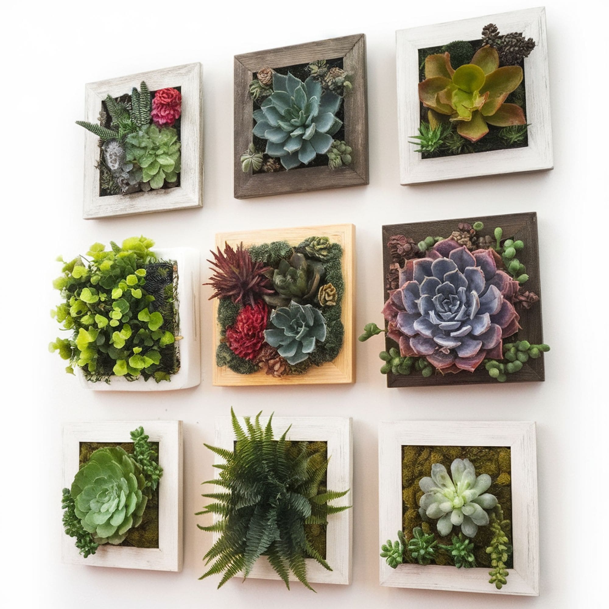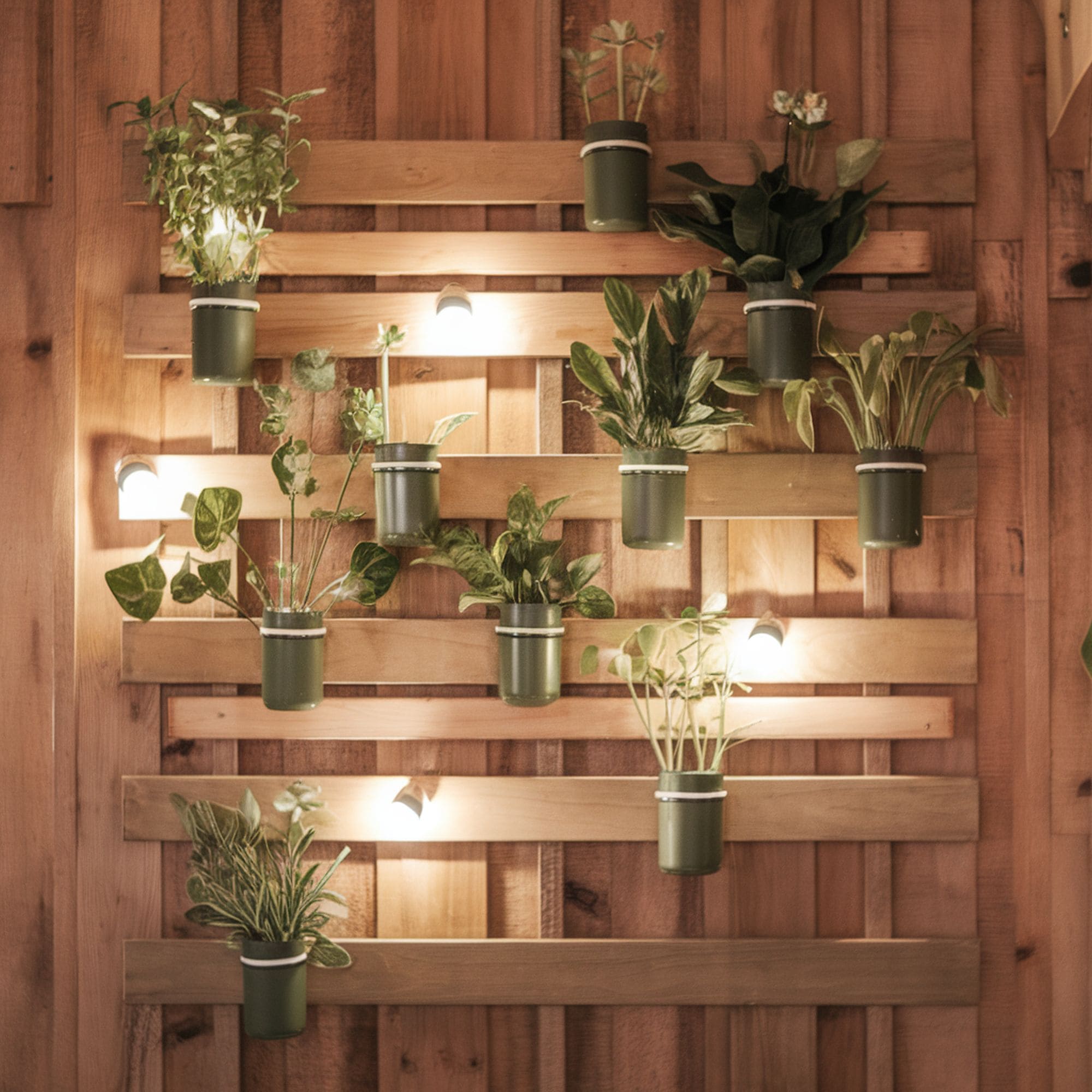 If you have large, empty walls, you can beautifully decorate them using a few pots and lights. These wooden frames can be personalized to your liking, turning them into centerpieces that will complement the overall design of your home. This setup involves tiny plants that decorate the wood, making it absolutely stunning.