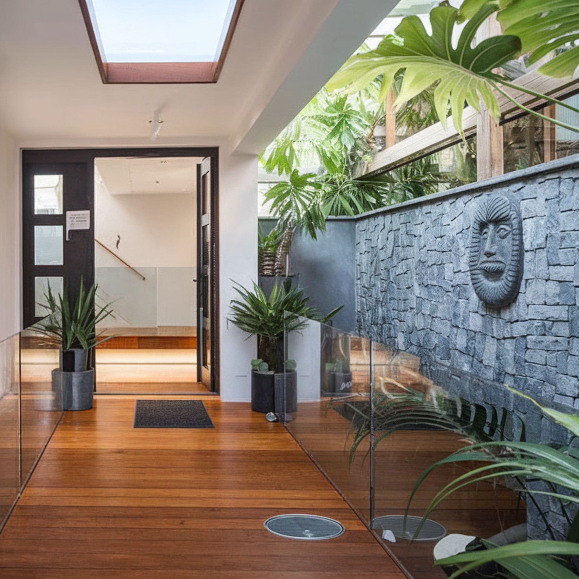 If your home is not very well-lit, you can choose shade plants. These plants do not take up space, but they add an exotic touch. This owner decided to brighten up the coldness of the stones, glass, and wood.