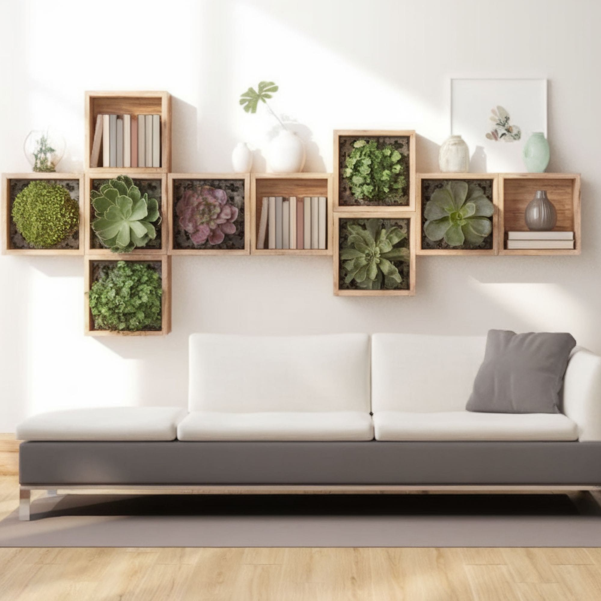You can turn your living room into an actual “living” place using plants. These boxes can help you grow them instead of wall decoration. The interesting look can be achieved with low-maintenance air plants or even succulents, so you do not need to worry about watering them often.