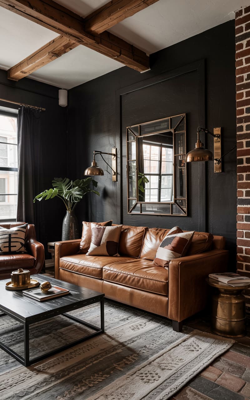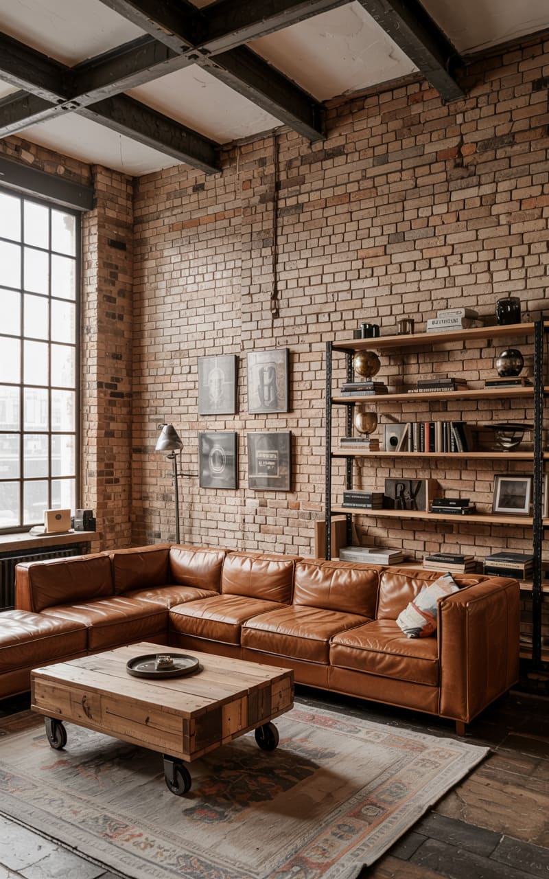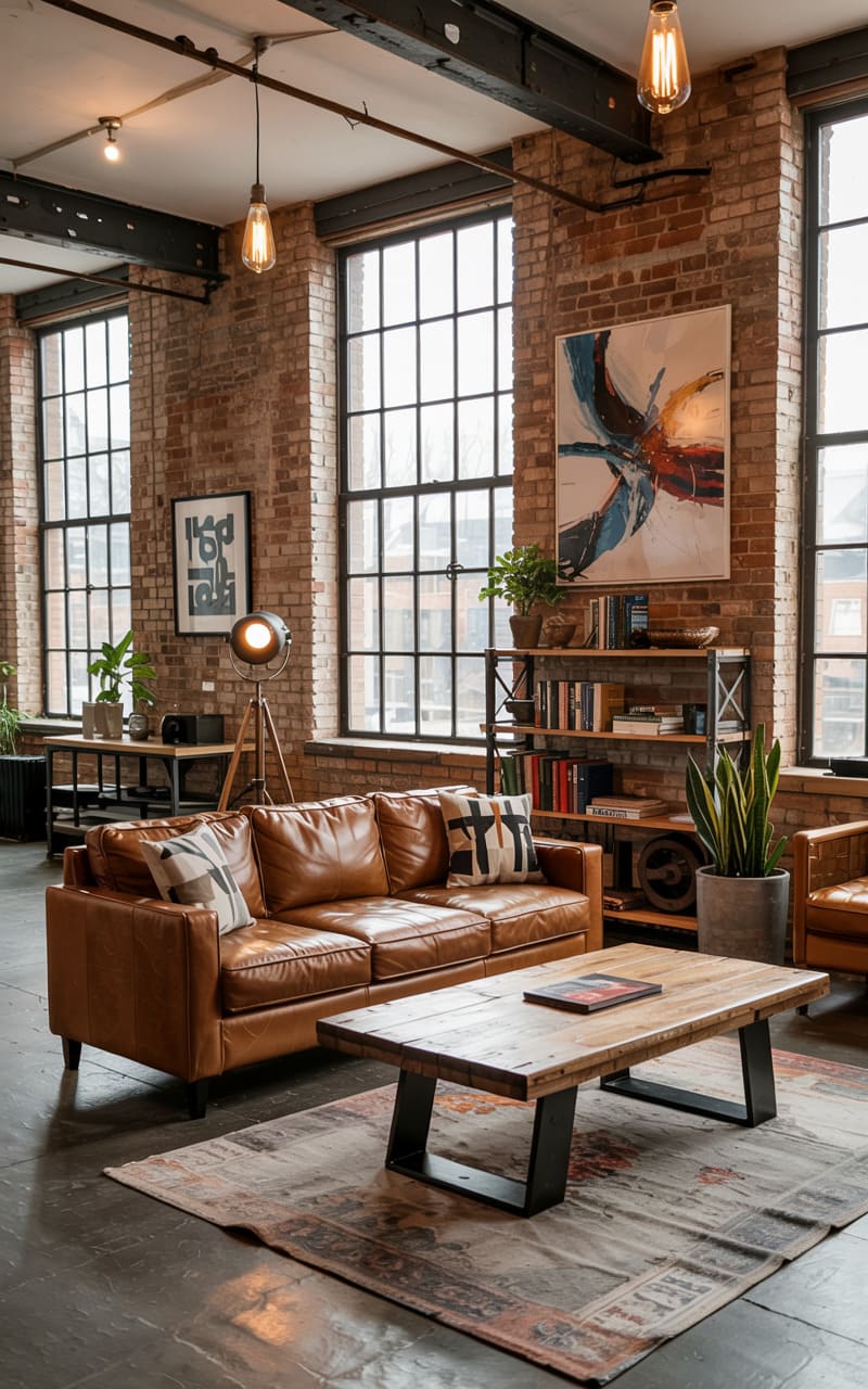The loft-like space hums with an urbane, lived-in charm, where exposed brick and steel girders frame tall, gridded windows. A buttery leather sofa anchors the room, its warm tones echoed in the rustic wood and iron coffee table. Painterly strokes of color in a modern artwork catch the eye, while a tripod lamp and pendant lights cast a soft, ambient glow, highlighting the room’s textured layers.