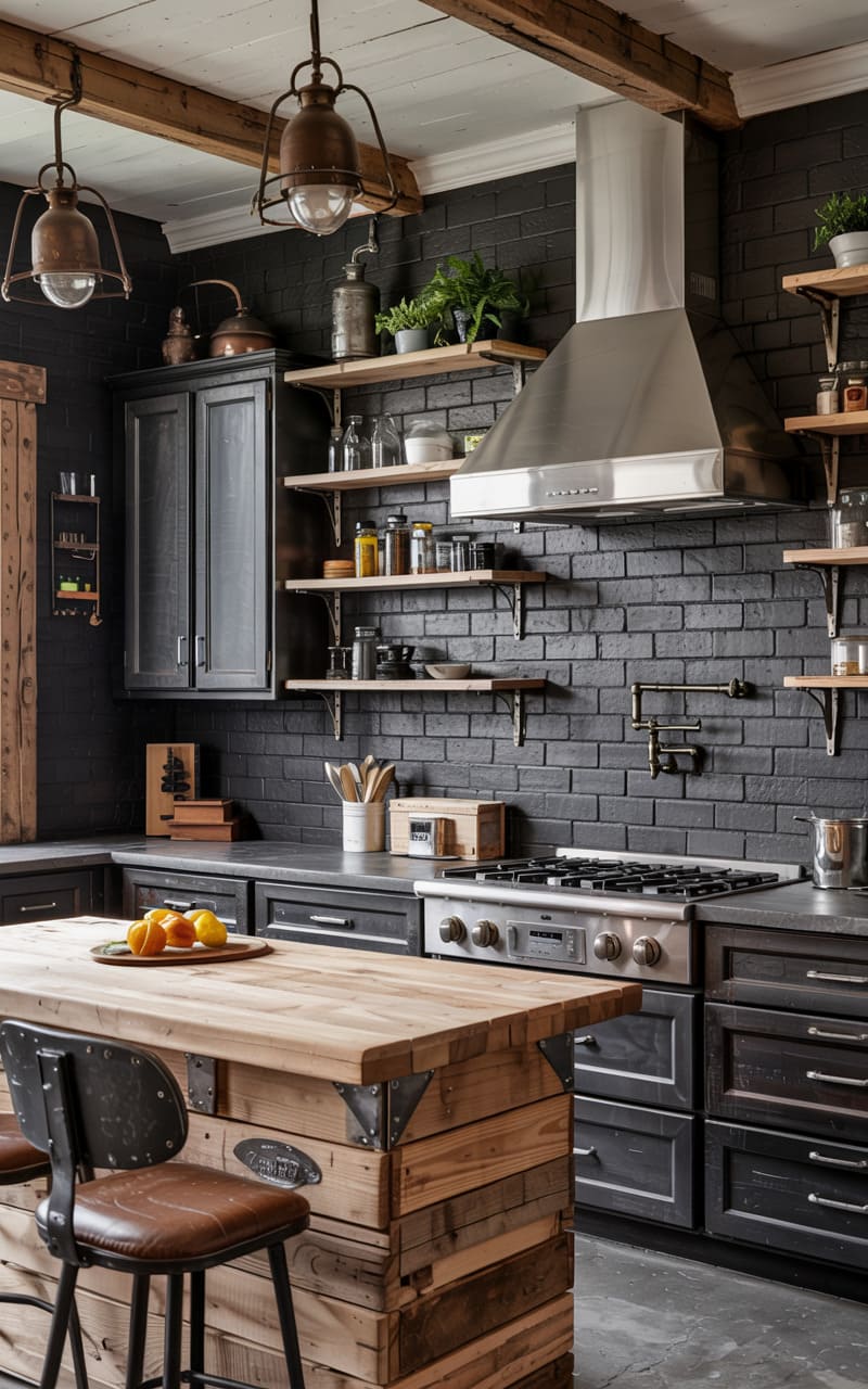 This room is a moody masterpiece of industrial chic, where charcoal brick walls and cabinetry absorb light like a secret, setting the stage for the warm glow of vintage pendant lights. Raw wood beams and chunky shelves, laden with glass jars and greenery, inject rustic charm against the sleek stainless steel of the range hood and appliances. The centerpiece, a butcher-block island crafted from reclaimed timber, anchors the space with its sturdy, utilitarian beauty, hinting at stories of past lives and hearty meals.