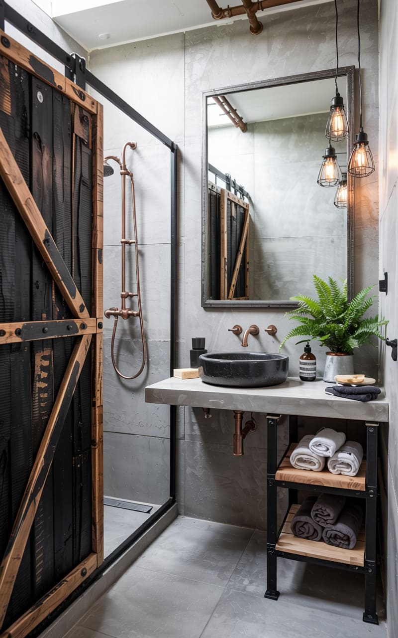This space exudes an edgy, urban vibe, where raw materials meet refined design. The rough-hewn, charred wood of the sliding barn door contrasts starkly with the sleek, polished concrete tiles lining the walls. Copper plumbing accents, left exposed, snake across the shower wall, echoing the warm glow of the pendant lights suspended above the modern, dark-stone sink. A touch of organic softness is introduced by the potted fern, nestled beside neatly folded towels on a simple, industrial-style shelf. It’s a curated collision of textures and tones that feels both intentional and effortlessly cool.