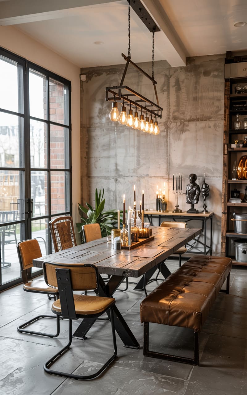 The room pulses with an edgy elegance, a raw concrete wall a stark backdrop to the warm, reclaimed wood of the dining table. A skeletal chandelier, its bare bulbs glowing softly, hangs above, casting a gentle light on the eclectic mix of leather seating and metal accents. Through the expansive, dark-framed windows, a hint of the outside world peeks in, a silent observer to the curated urban chic within.