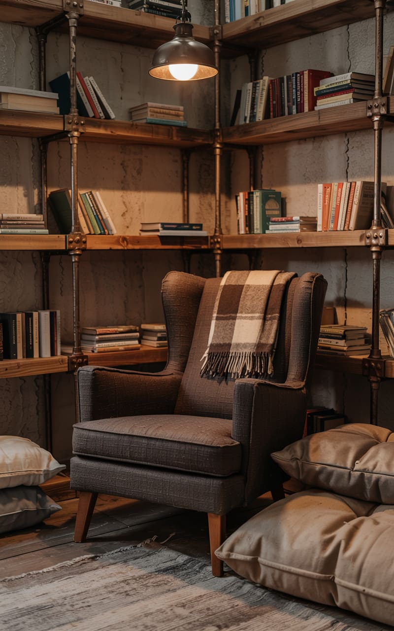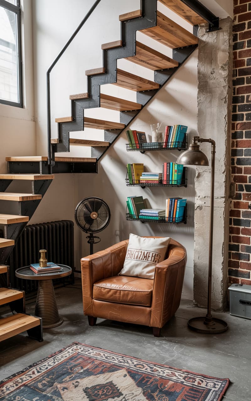 8. Industrial Reading Nook Under a Steel Staircase