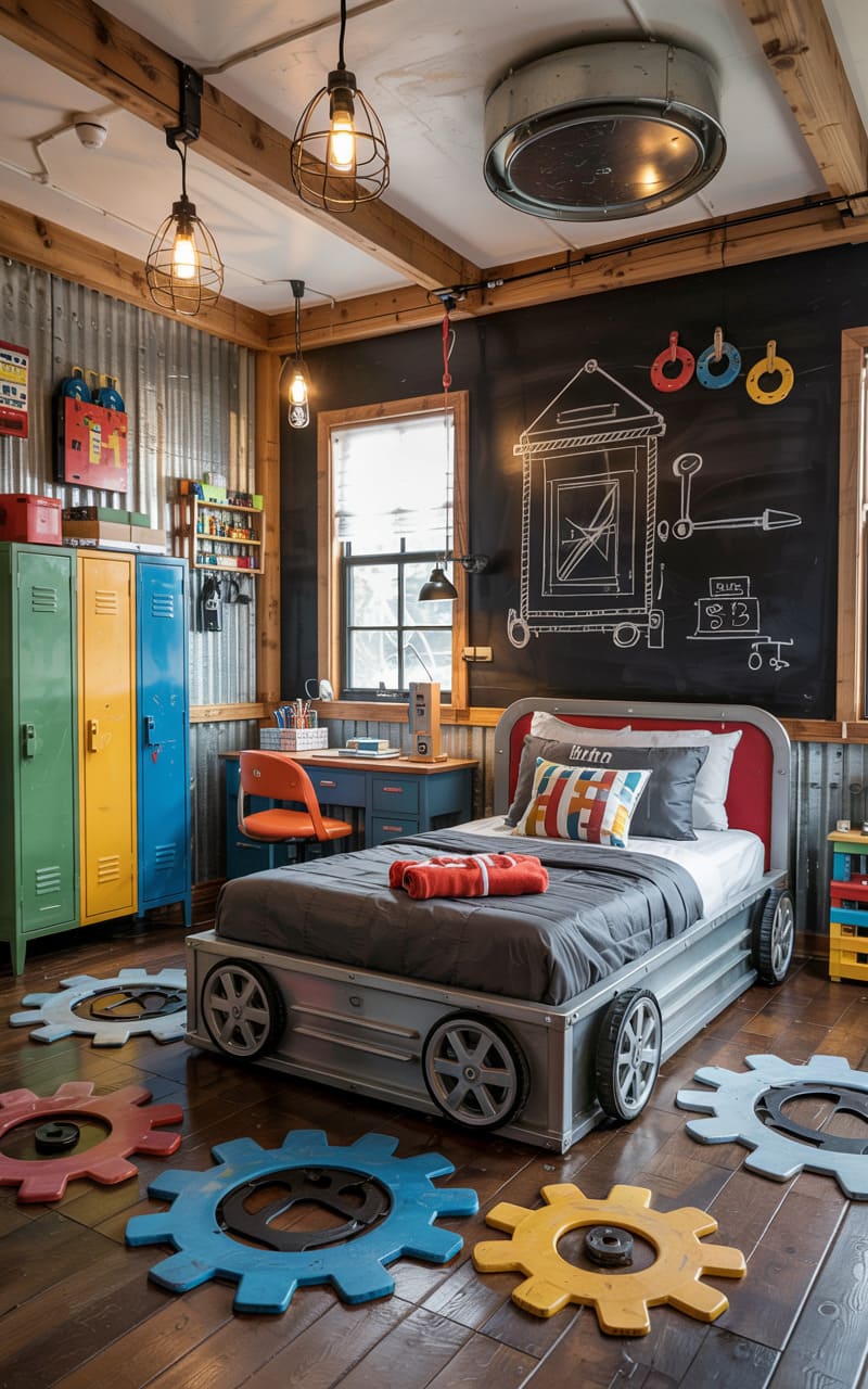 This isn’t your average kid’s room; it’s a gearhead’s dream. A low-slung, metal-framed bed with real-looking wheels anchors the space, while oversized, colorful gears scatter across the wood plank floor like dropped puzzle pieces. Raw, corrugated metal walls and exposed beams give a nod to the industrial, a stark contrast to the whimsical chalk drawings on the blackboard wall. A vintage locker set and Edison bulb pendants complete the look, creating a space that’s equal parts workshop and hideaway.