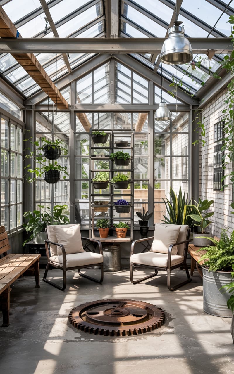 This space marries the raw, utilitarian charm of industry with the lush embrace of nature. A skeletal frame of steel and glass soars overhead, filtering the day into a diffused glow that illuminates the concrete floor and a massive, rusted gear anchoring the center. Potted plants, both hanging and clustered, soften the edges of the room, climbing the brick walls and mingling with the simple, inviting armchairs. It’s a sanctuary carved from the bones of something functional, now reborn as a place of quiet contemplation.