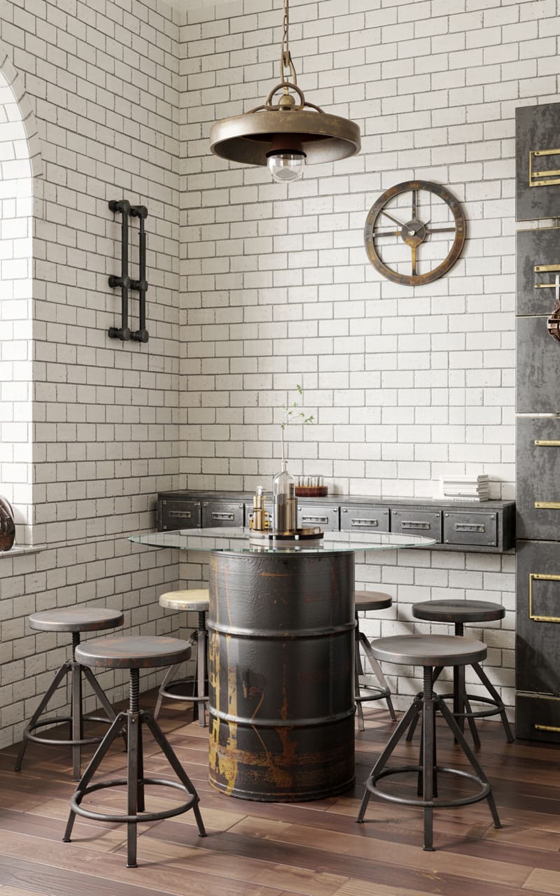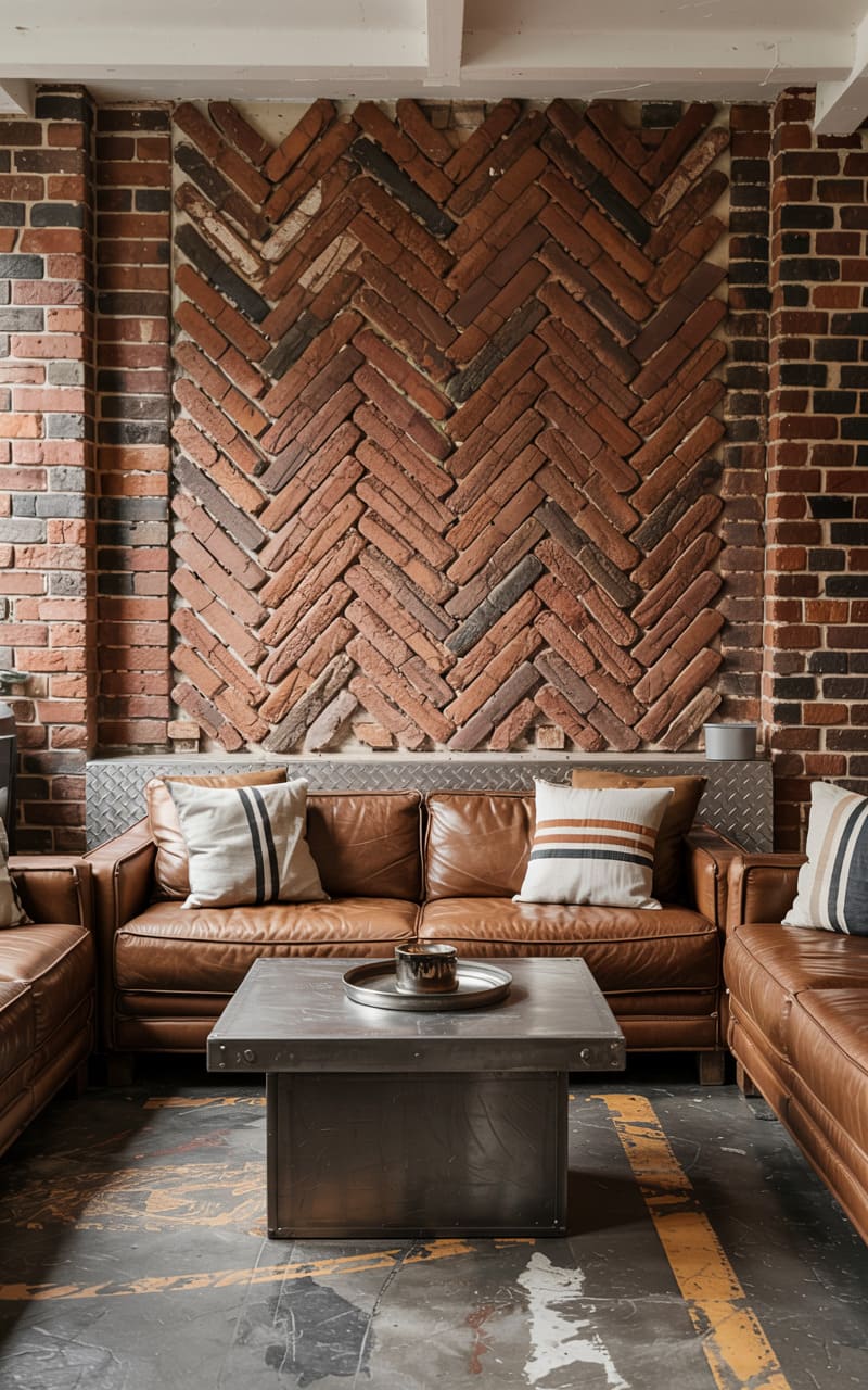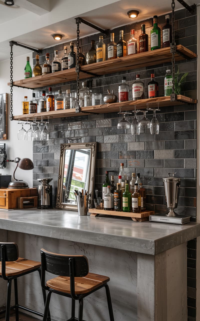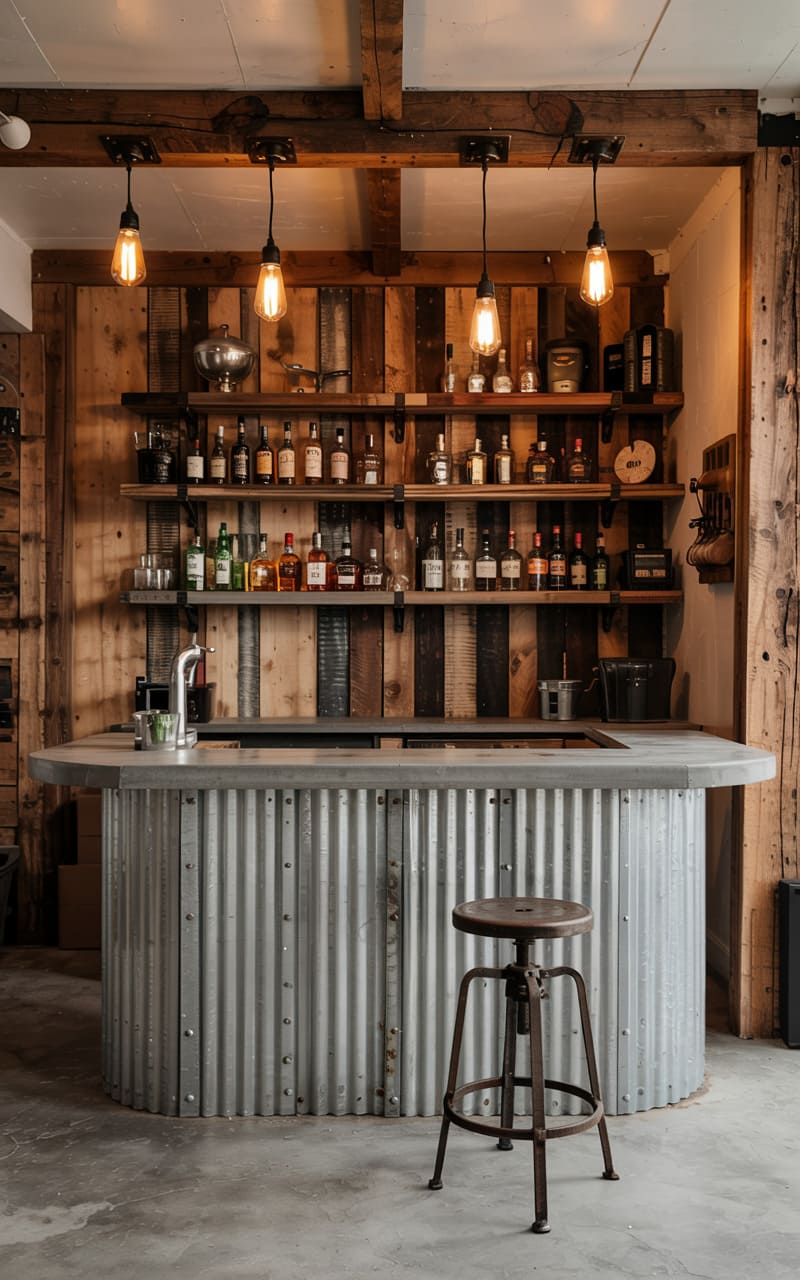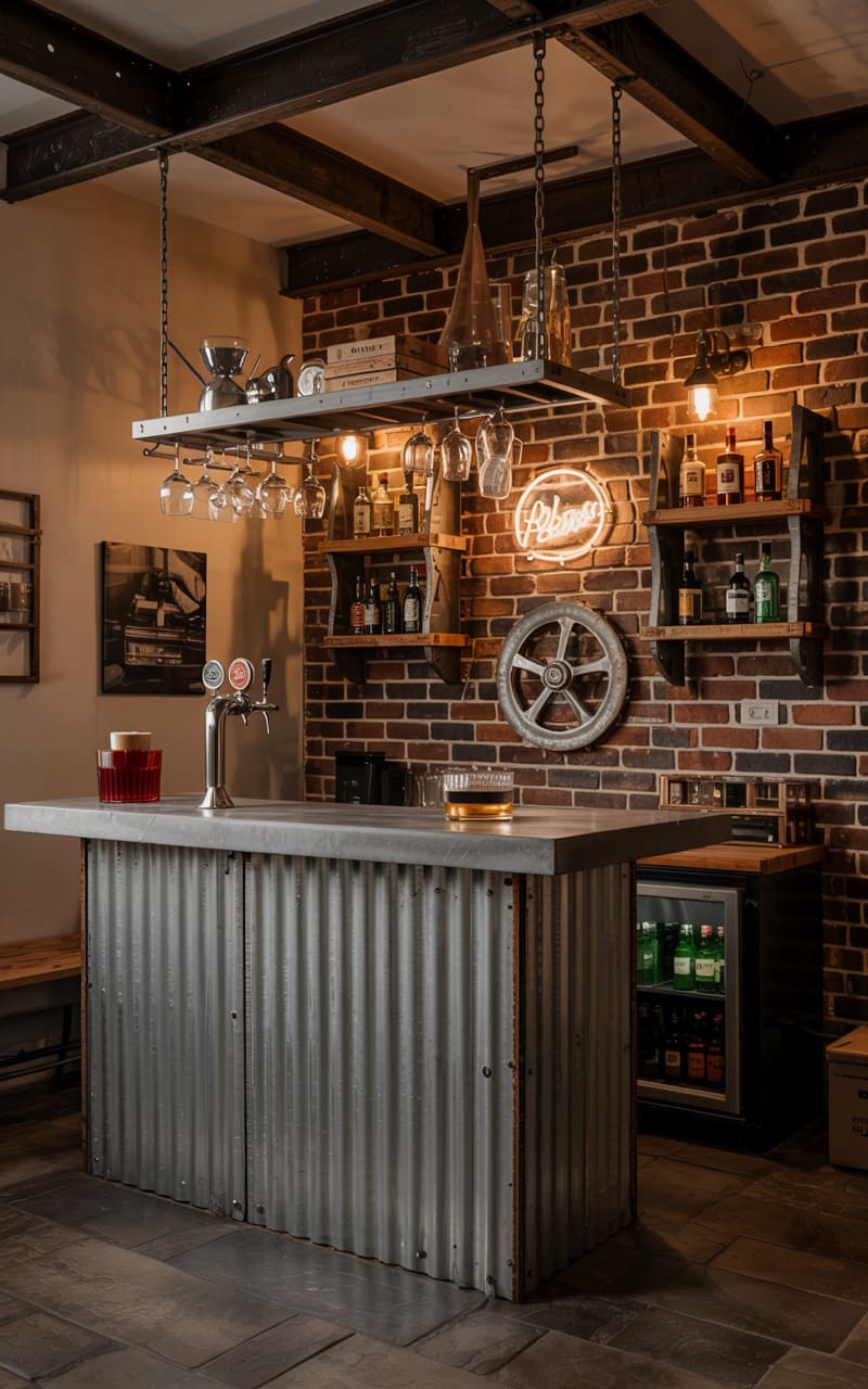 12. Industrial Home Bar with Recycled Metal and Brick