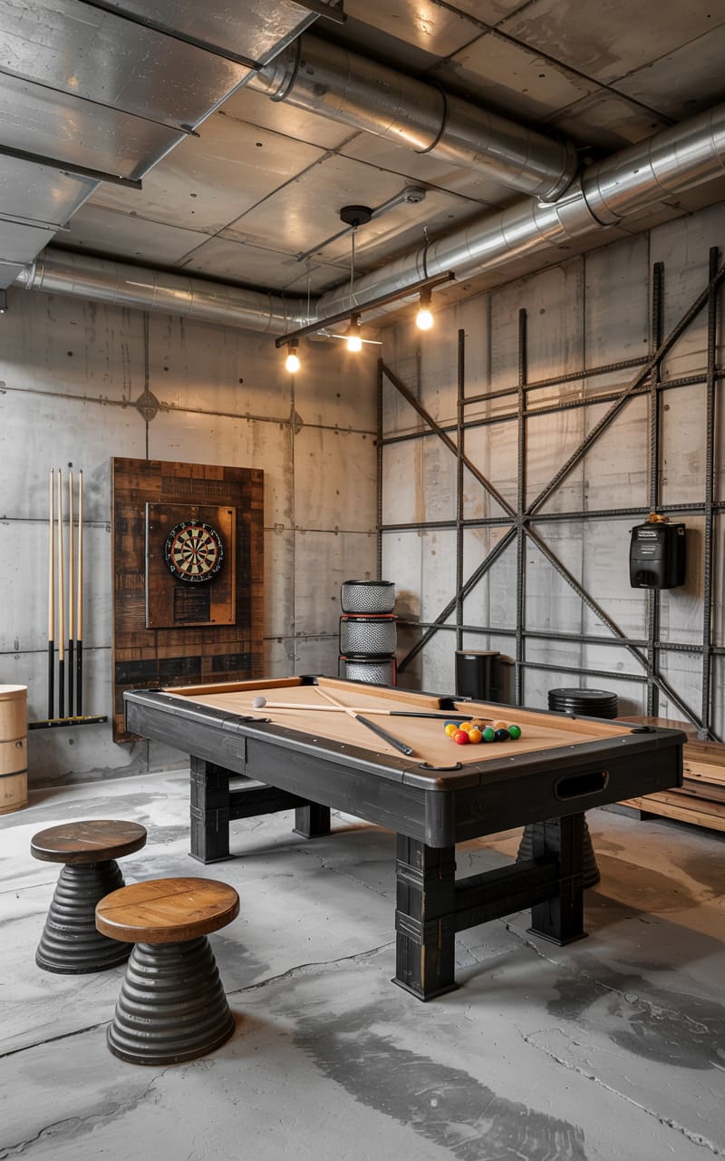 This raw, edgy space feels like a secret haunt carved from a forgotten factory. A pool table anchors the room, its felt a splash of warmth against the cool, unfinished concrete walls. Crude metal framework crisscrosses one side, a skeletal echo of the room’s industrial soul, while a dartboard on a rustic wooden panel hints at playful competition. Overhead, exposed pipes snake across the ceiling, punctuated by the warm glow of pendant lights, casting a soft, intimate illumination on the scene. It’s a place where you’d expect the clink of pool balls and the low hum of conversation, a refuge with a rebellious spirit.