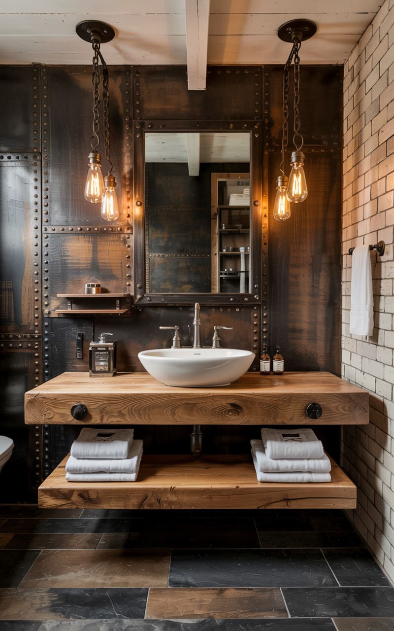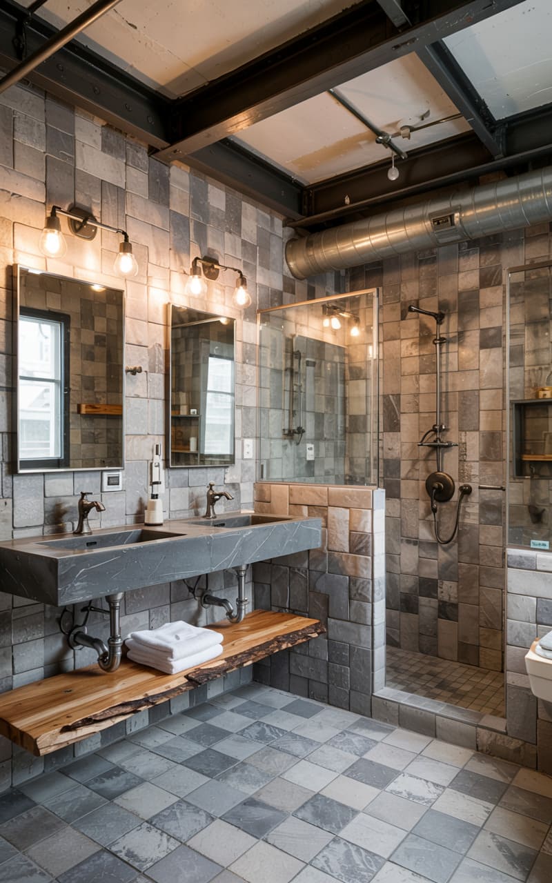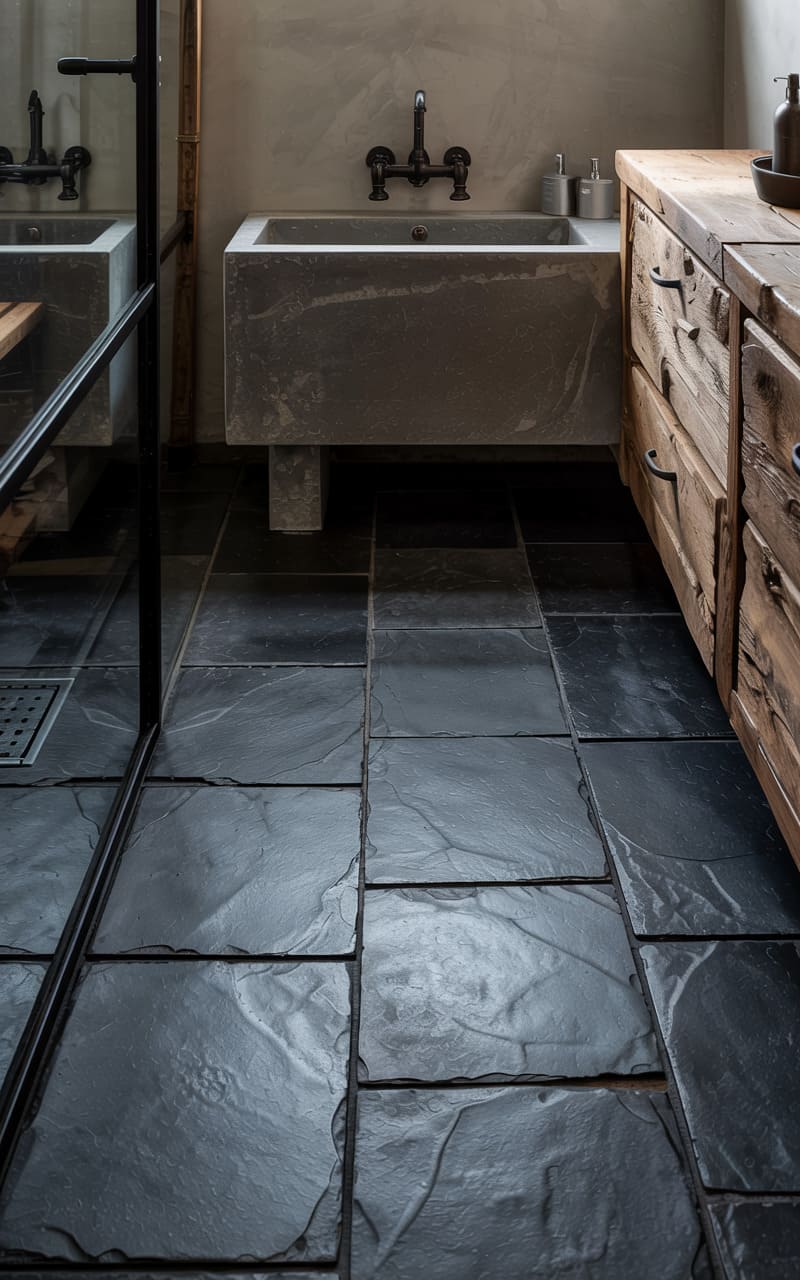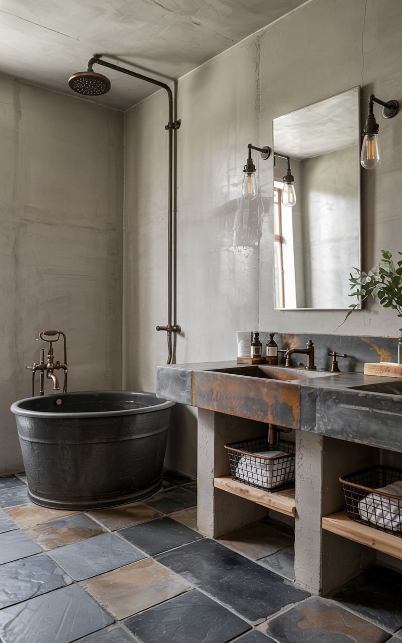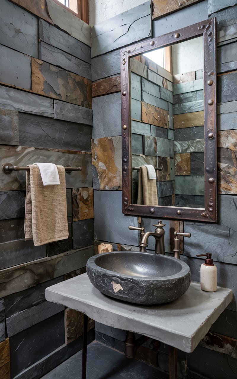34. Industrial Bathroom with Raw Slate and Pitted Metal