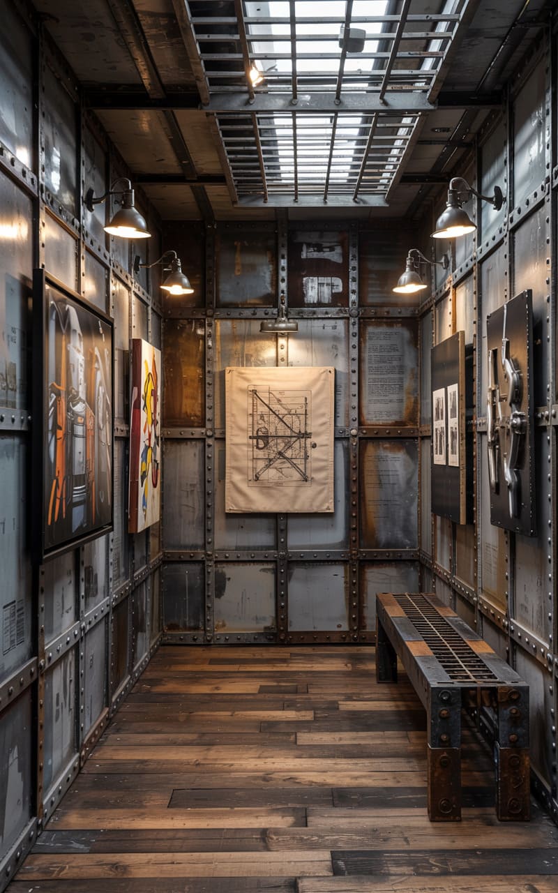 This narrow, almost claustrophobic space feels like a secret chamber salvaged from a forgotten submarine, its riveted metal walls whispering tales of steam and steel. Art hangs against the weathered panels, illuminated by the warm glow of vintage sconces, while a slatted bench promises a moment’s respite amidst the raw, evocative aesthetic. A grid of skylights overhead hints at the world beyond, filtering a diffused luminescence into the room’s industrial heart.