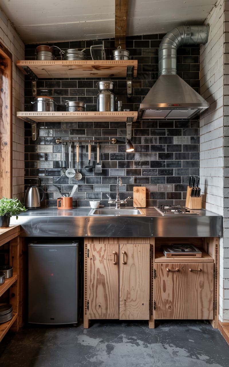 This kitchen, a rustic haven of function over fuss, marries the raw charm of plywood cabinetry with the cool, utilitarian gleam of a stainless steel countertop. Dark, glossy tiles reflect ambient light, hinting at a grittier past, while open shelves display a well-loved collection of pots and pans. A hefty metal range hood stands sentinel, promising hearty meals, and a tiny fridge tucked beneath suggests a space designed for efficient, no-nonsense living. It’s a space that whispers of stories told over steaming stovetops and the simple joy of a well-worn home.