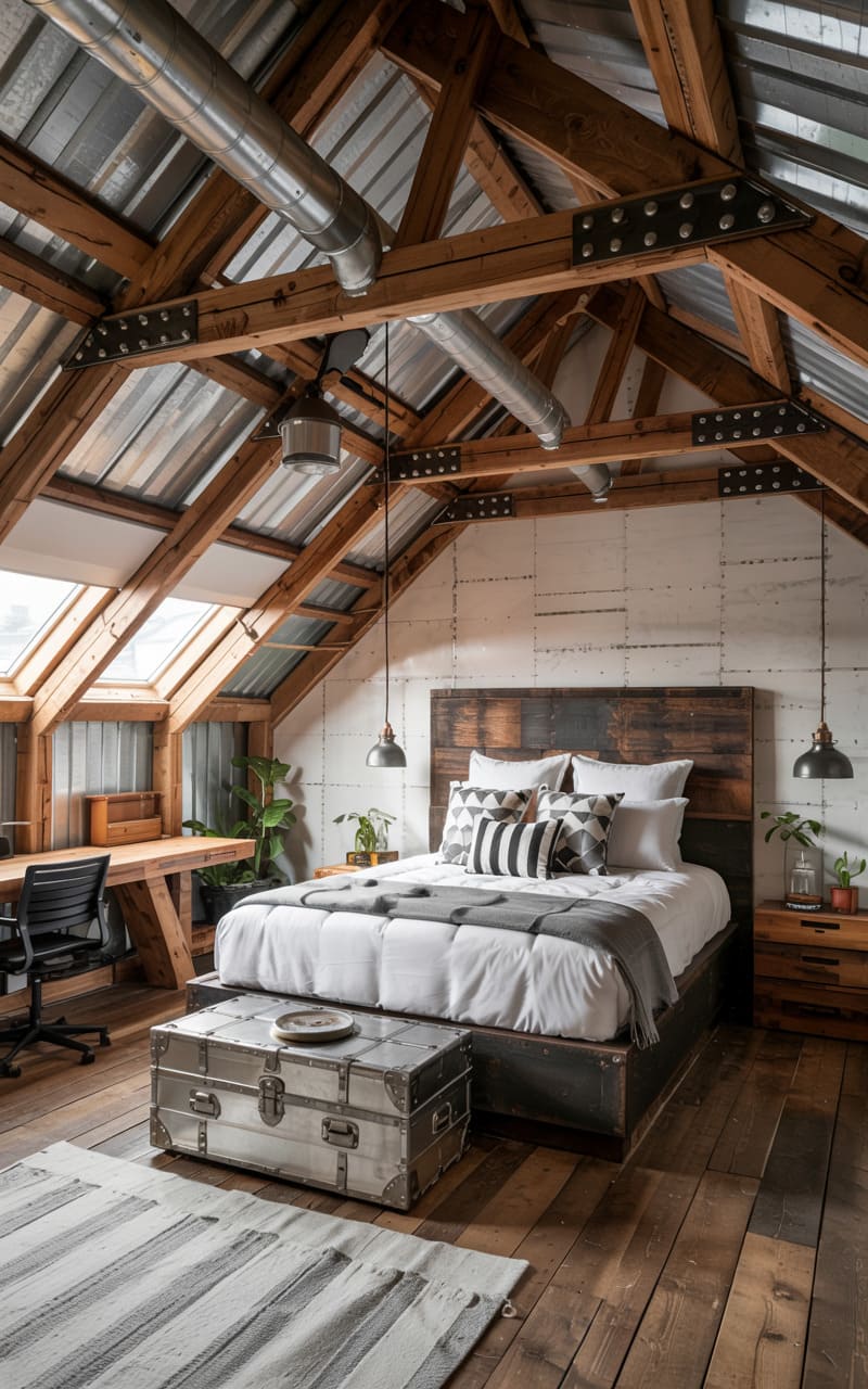 Raw timber trusses crisscross overhead, framing a pitched ceiling of corrugated metal that hints at a repurposed warehouse. A platform bed, grounded by a vintage steamer trunk, anchors the space, while pendant lights dangle like industrial teardrops. The room, a study in contrasts, balances the starkness of exposed metal and concrete-like panels with the warmth of aged wood planks underfoot, suggesting a space where rustic charm meets urban grit.