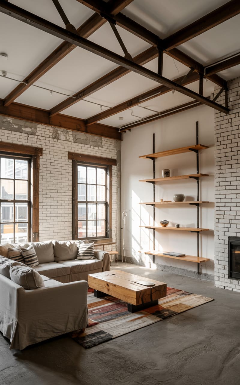 The room hums with raw, urban energy. Exposed brick, painted a ghostly white, stretches across the walls, a stark contrast to the dark, skeletal beams that crisscross the ceiling. A chunky, live-edge coffee table anchors the space, its rustic charm echoed by the simple, open shelving that climbs the far wall. Light streams in through tall, divided windows, casting long shadows and highlighting the room’s unpolished elegance. A plush, lived-in sofa invites you to sink in and soak up the atmosphere, a blend of grit and unexpected comfort.