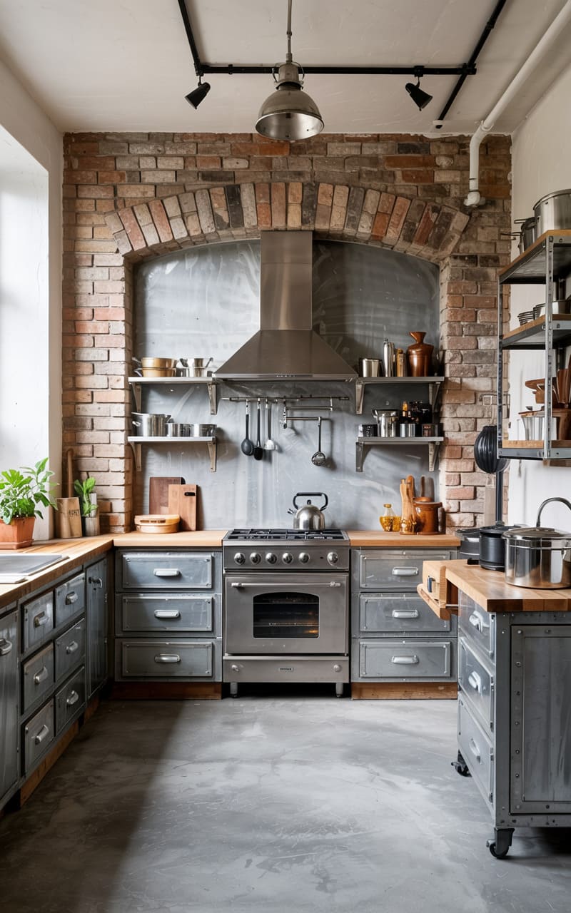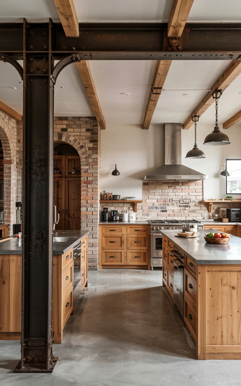 22. Industrial Kitchen with Steel Column Feature and Exposed Brick Archway