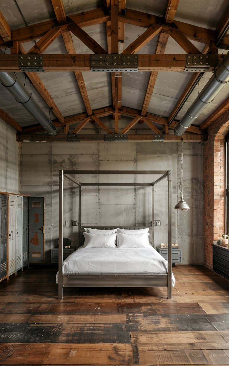 24. Industrial Bedroom with Exposed Trusses and Structural Bolts