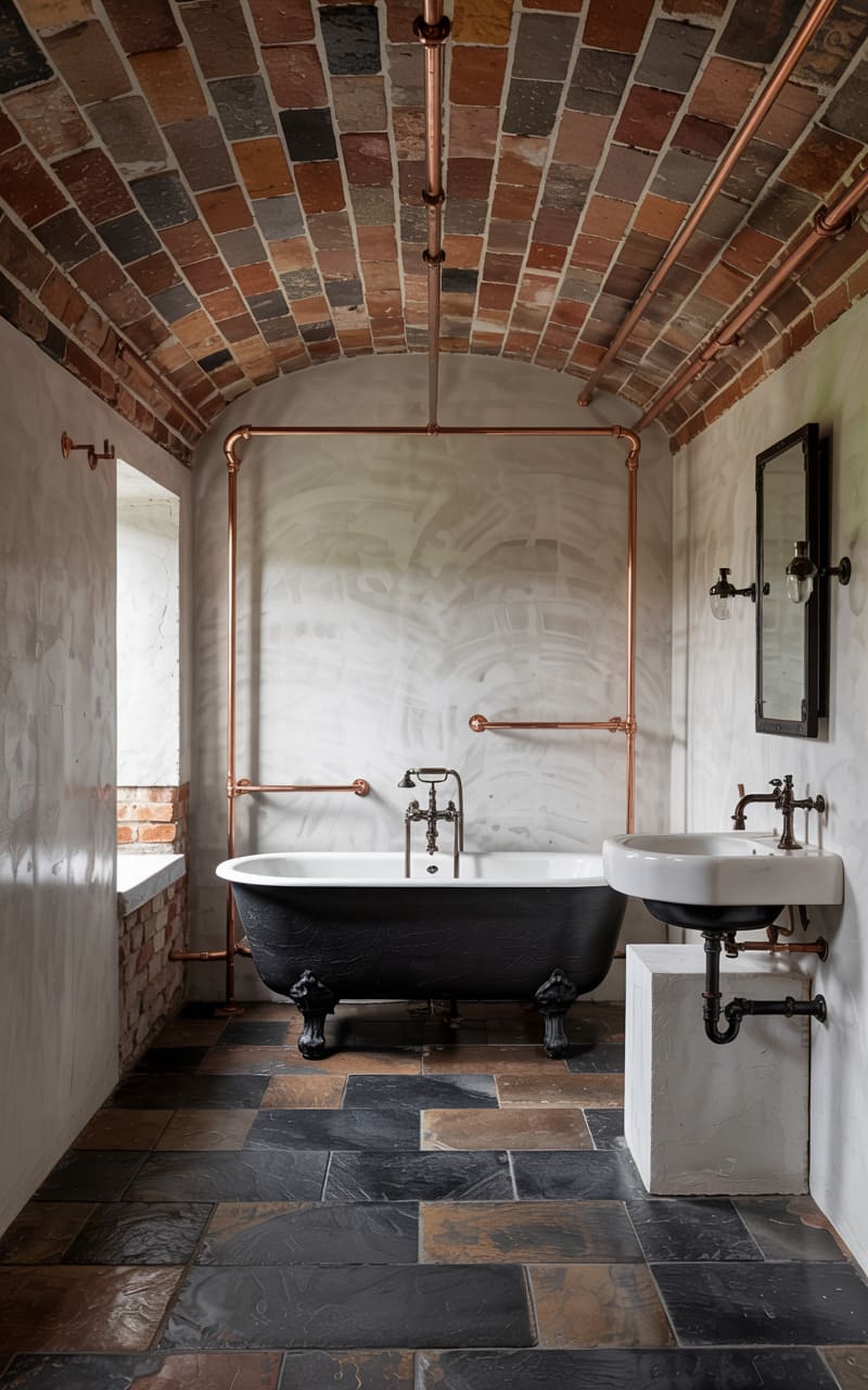 25. Industrial Bathroom with Vaulted Brick Ceiling and Exposed Pipework