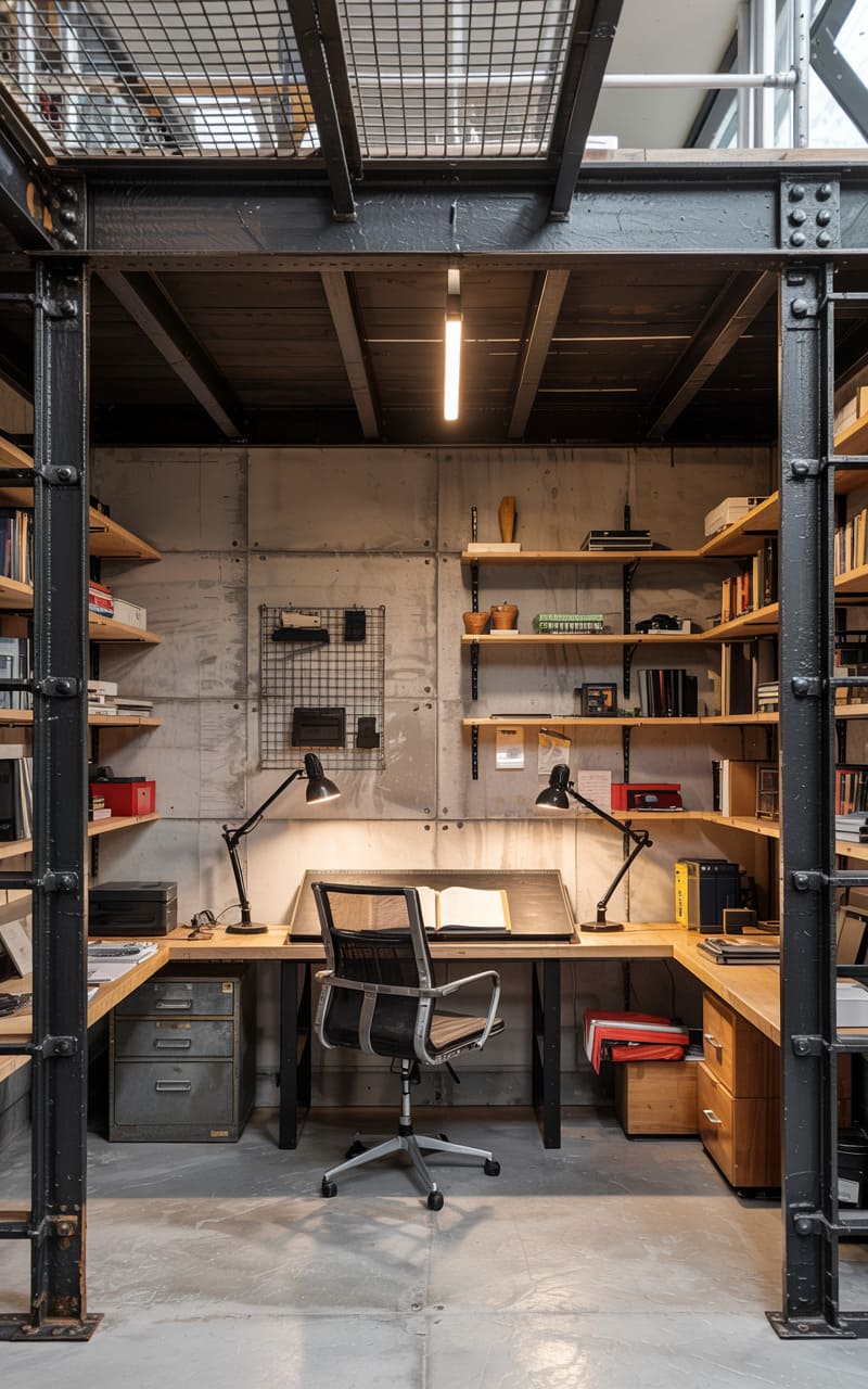 Tucked beneath a steel-beamed mezzanine, a workspace unfolds with a raw, almost defiant elegance. Concrete walls, textured with the ghost of their forming boards, cradle a desk bathed in the warm glow of twin task lamps. Bookshelves, crudely hewn from pale wood planks, flank the space, their contents a silent testament to the room’s purpose. The air hums with the promise of creation, a haven for the solitary mind amidst the skeletal strength of industrial design.