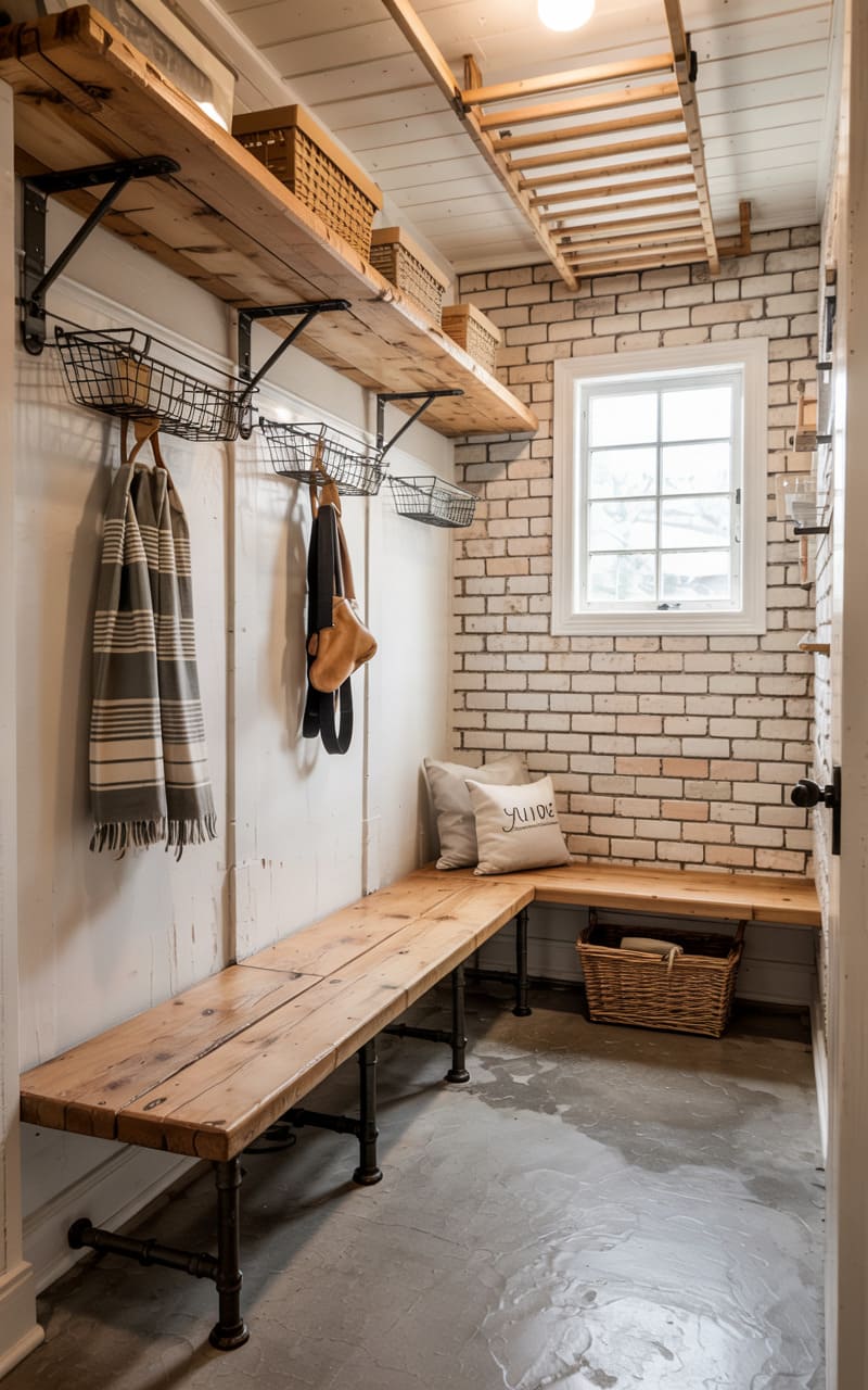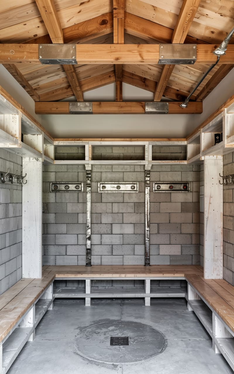 28. Industrial Mudroom with Exposed Ceiling Joists and Block Walls