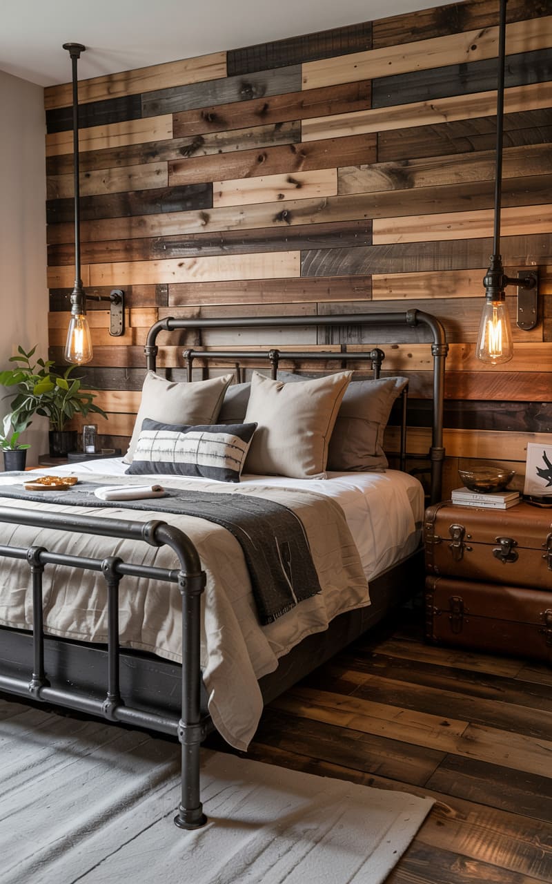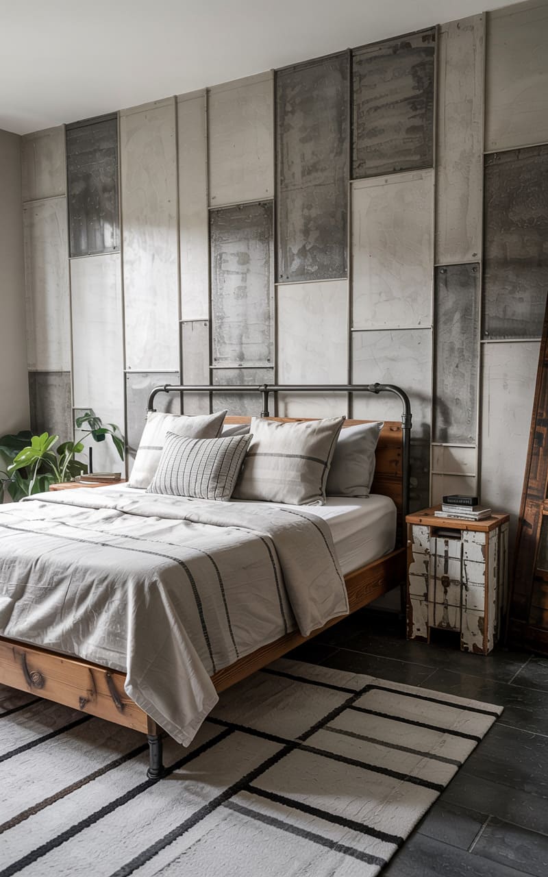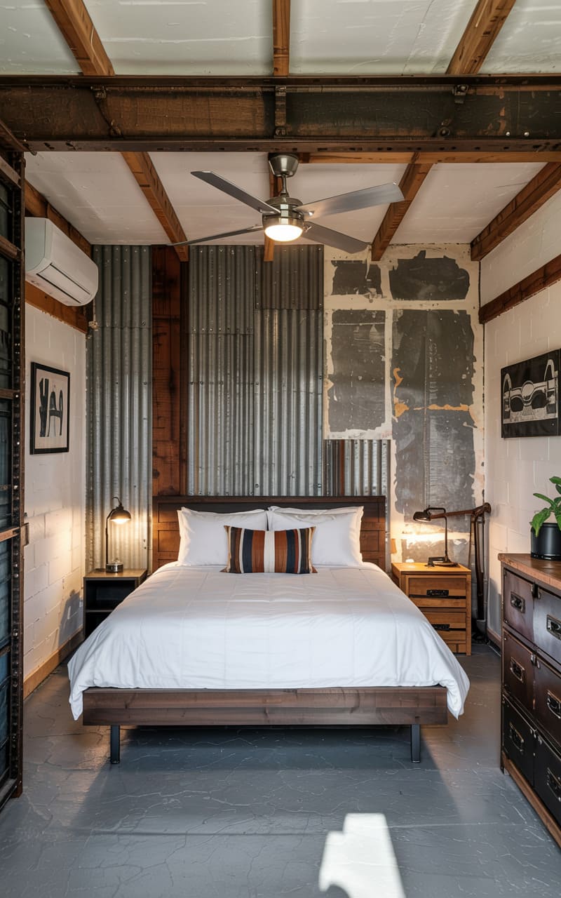 29. Industrial Guest Bedroom with Corrugated Metal Accent Wall and Steel Header