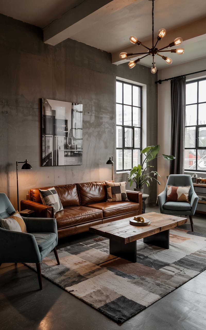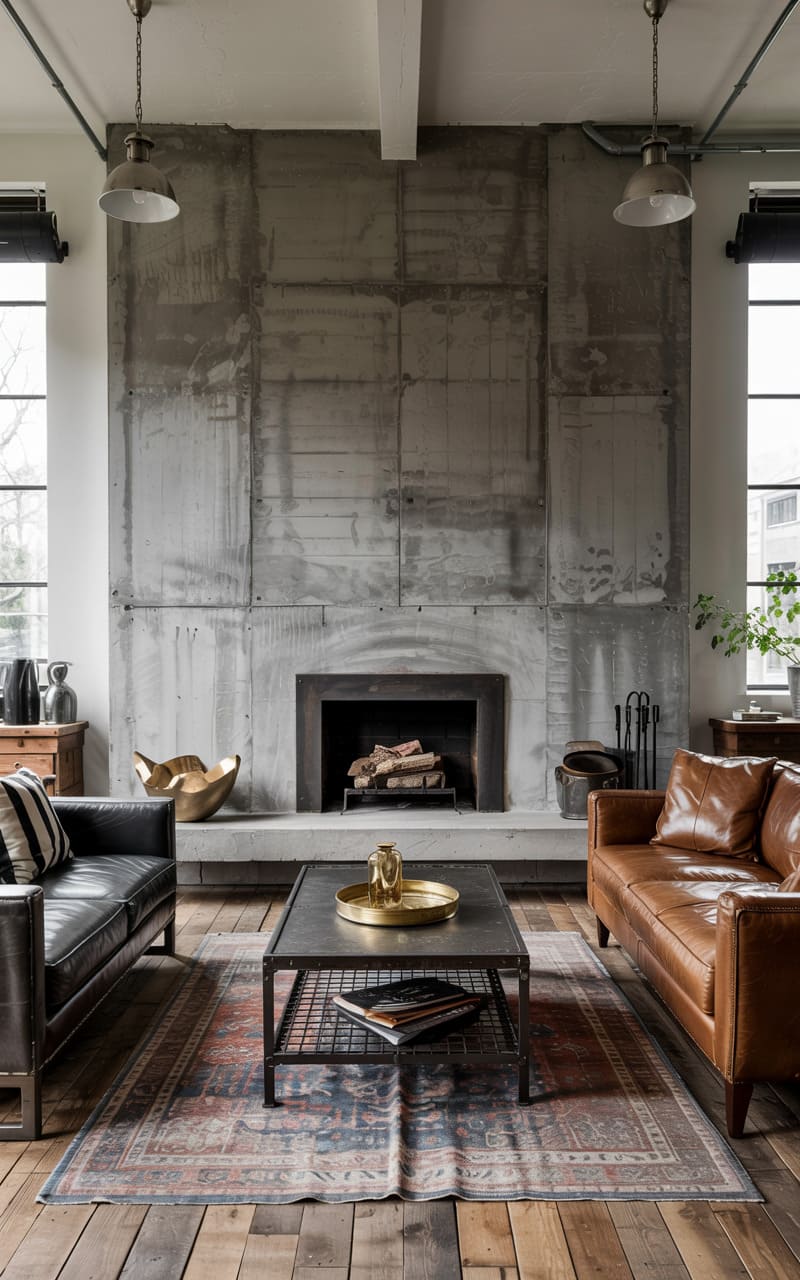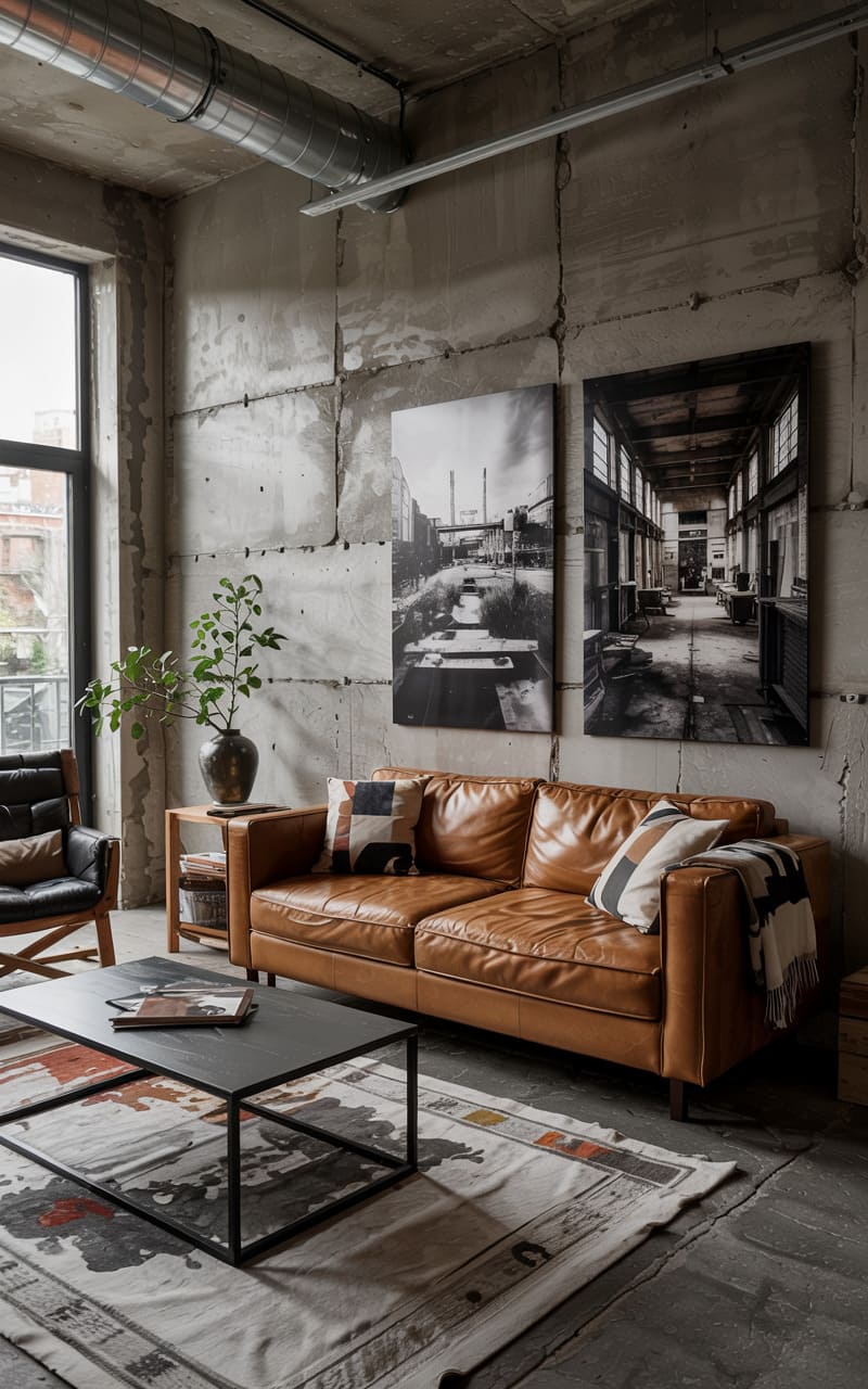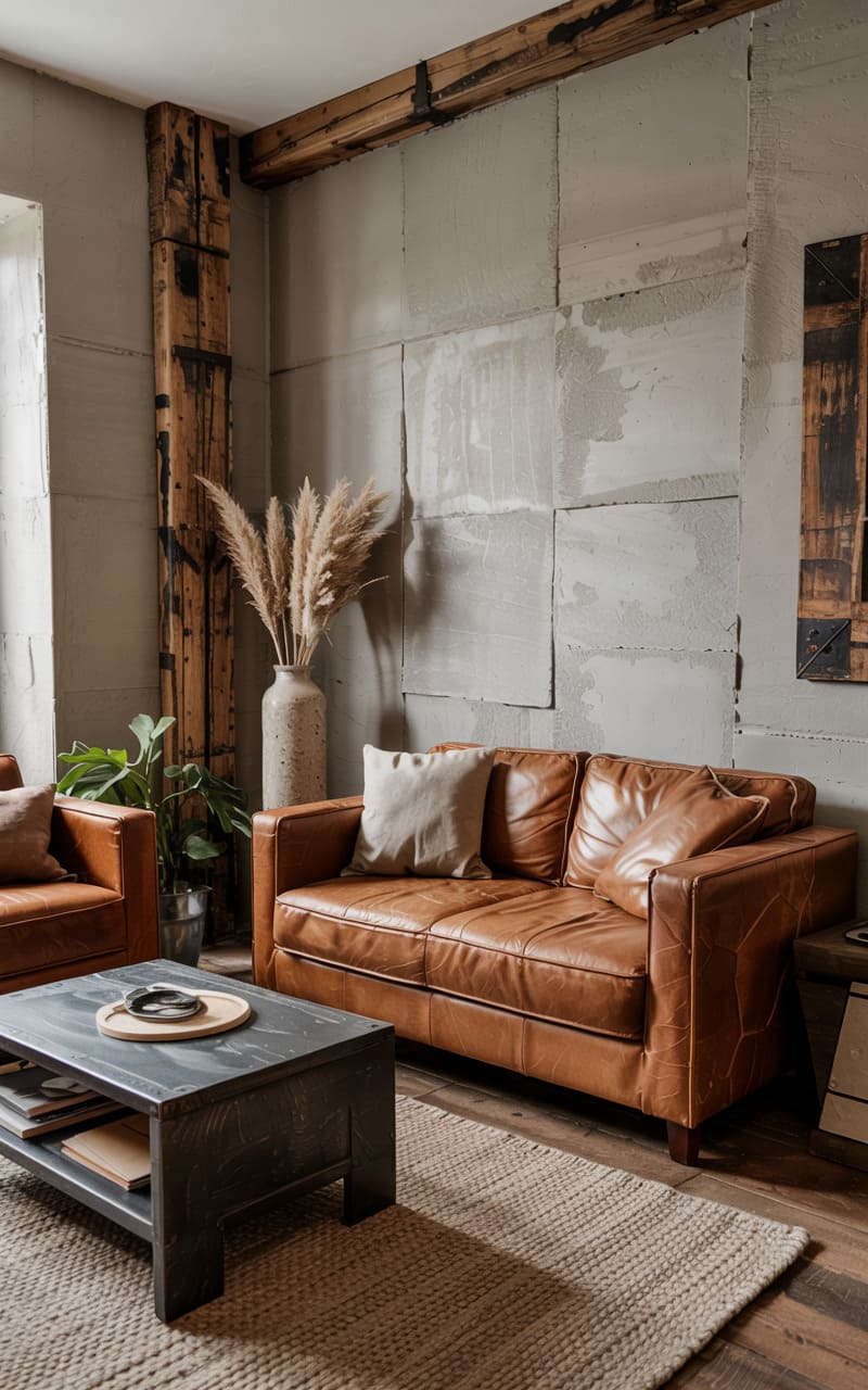 31. Industrial Living Room with Layered Concrete and Aged Leather Textures